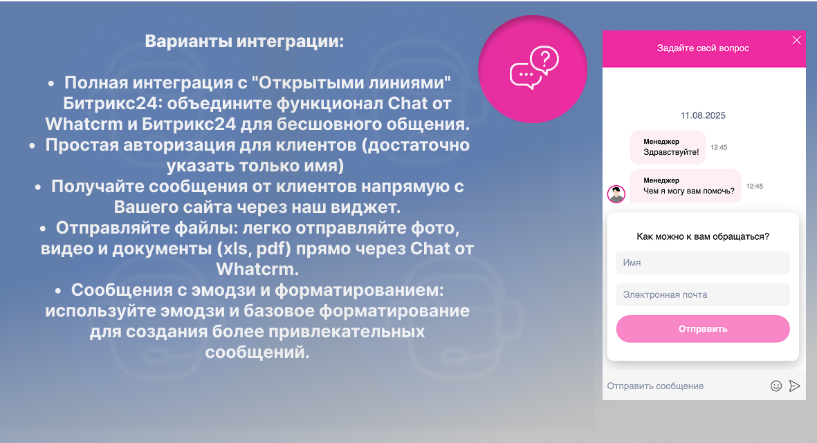 Полная интеграция с "Открытыми линиями" Битрикс24: объедините функционал Chat от Whatcrm и Битрикс24 для бесшовного общения.