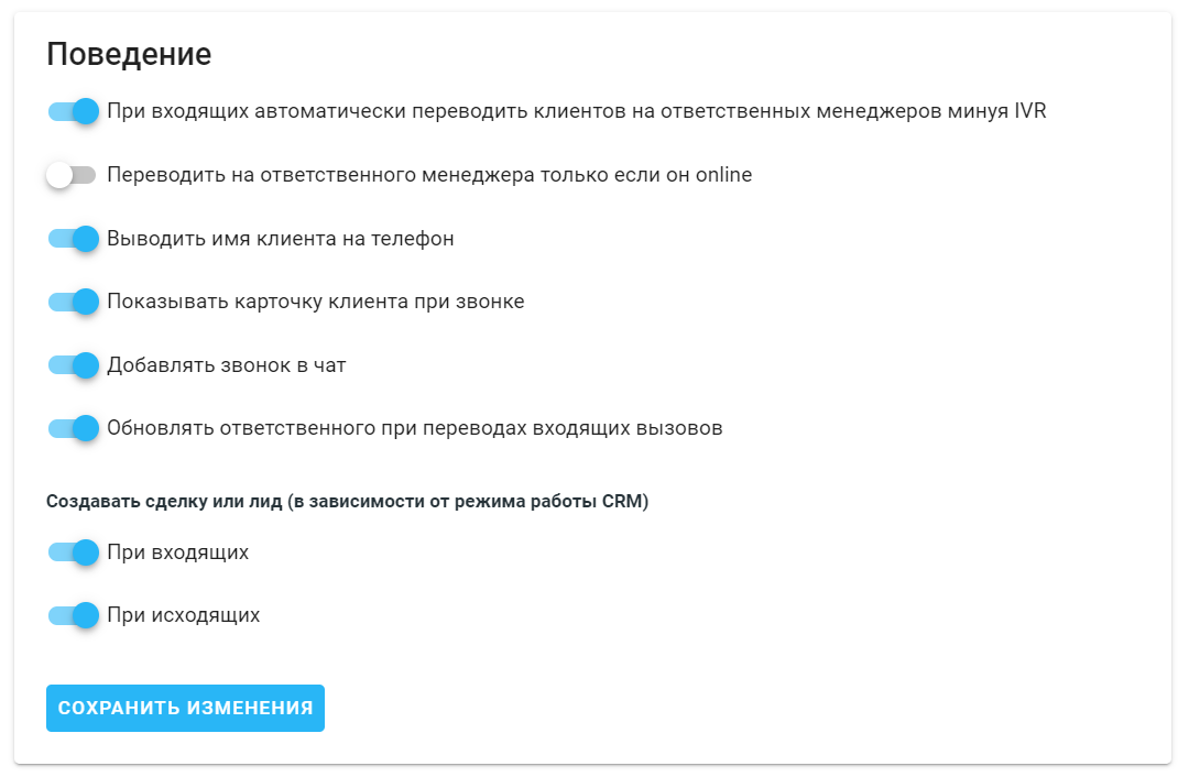 5. Задайте нужные вам настройки интеграции в разделе Поведение.