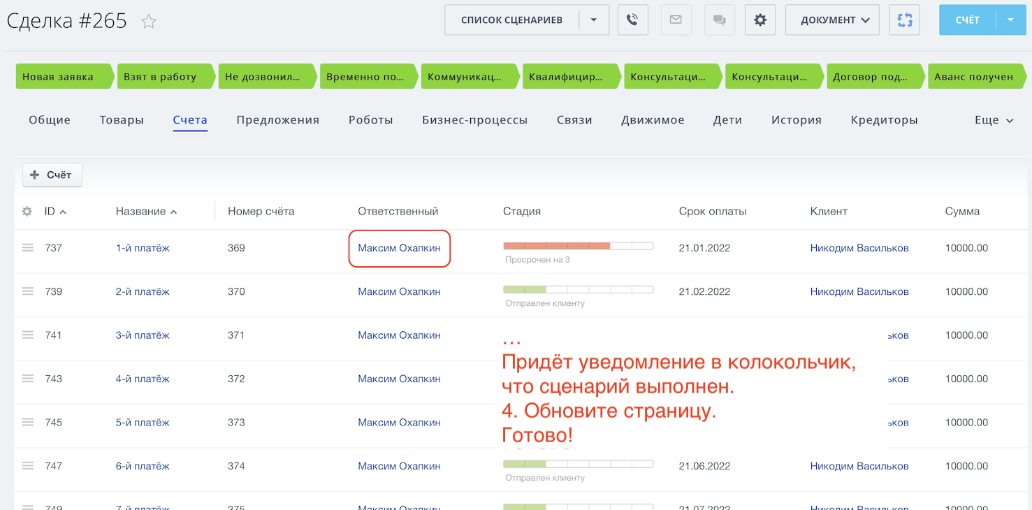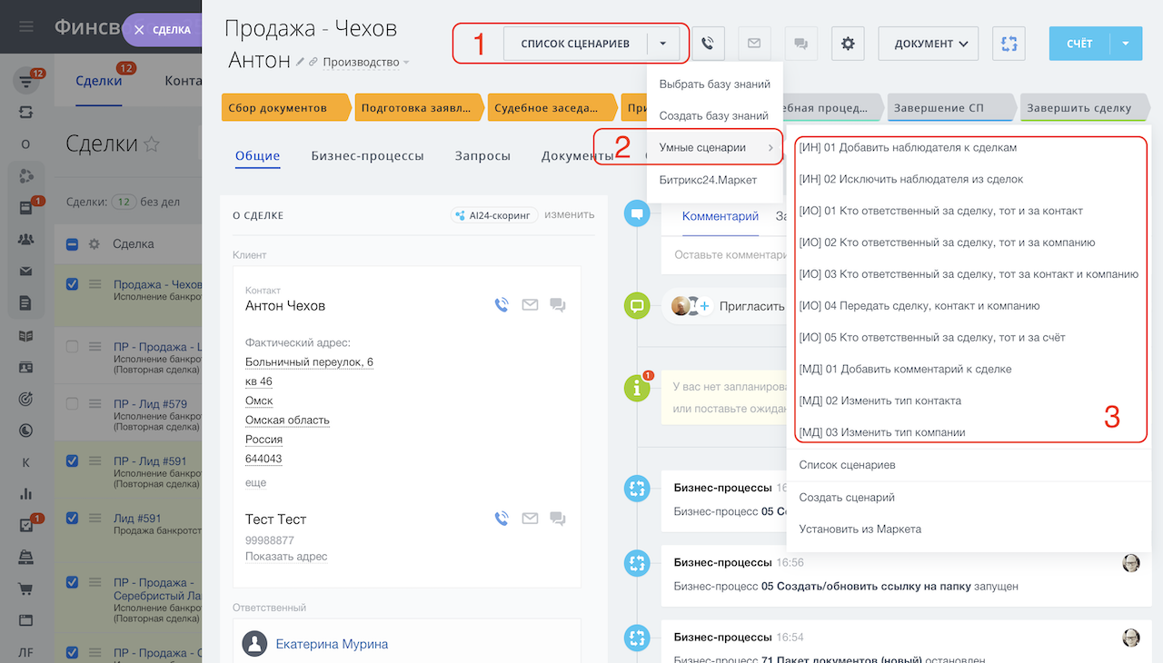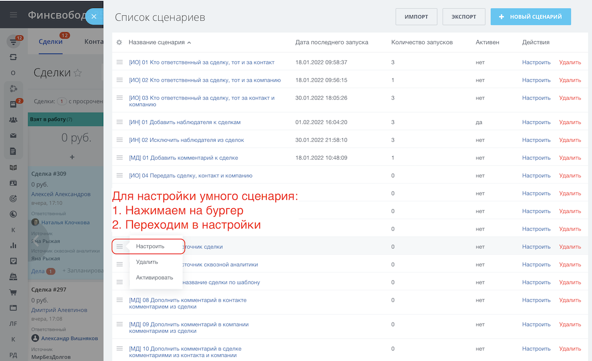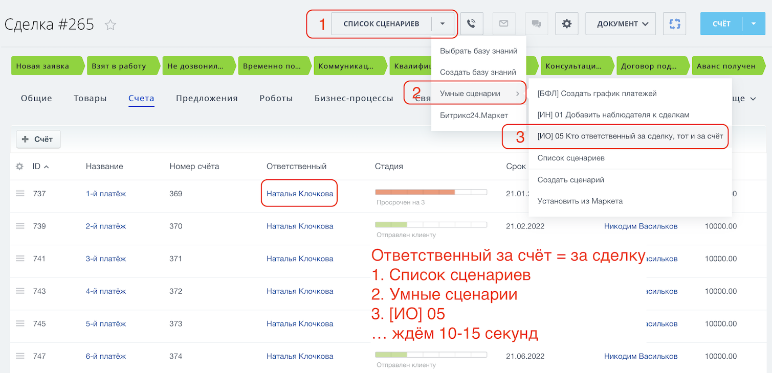 - Уволился сотрудник и нужно передать сделки на нового сотрудника вместе с контактами? Запустите умный сценарий "[ИО] 04 Передать сделку, контакт и компанию", а если к сделке привязаны ещё и счета, то "[ИО] 05 Кто ответственный за сделку, тот и за счёт".