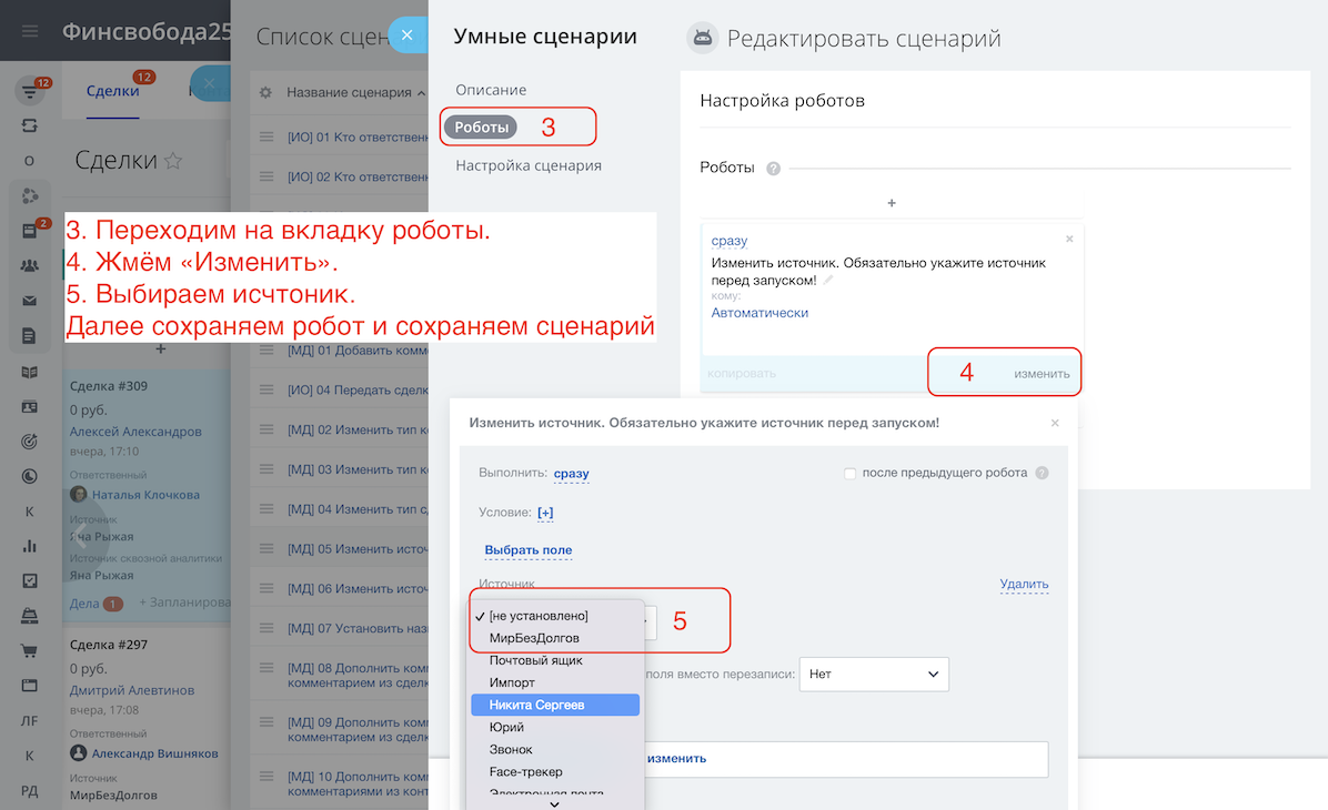 - Создалось 10 сделок с неверным источником? Можно менять руками, а можно запустить умный сценарий "[МД] 05 Изменить источник сделки".