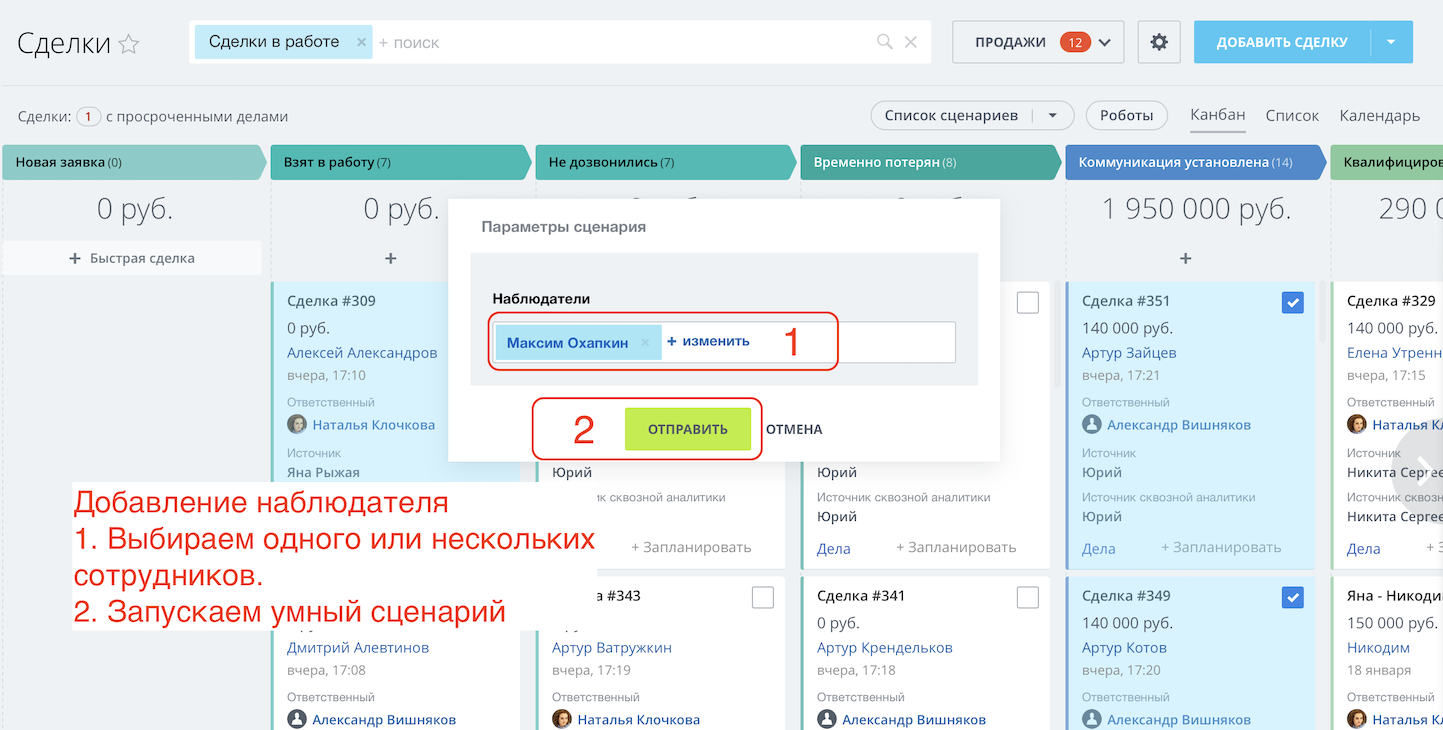 - Добавить наблюдателя к сделкам