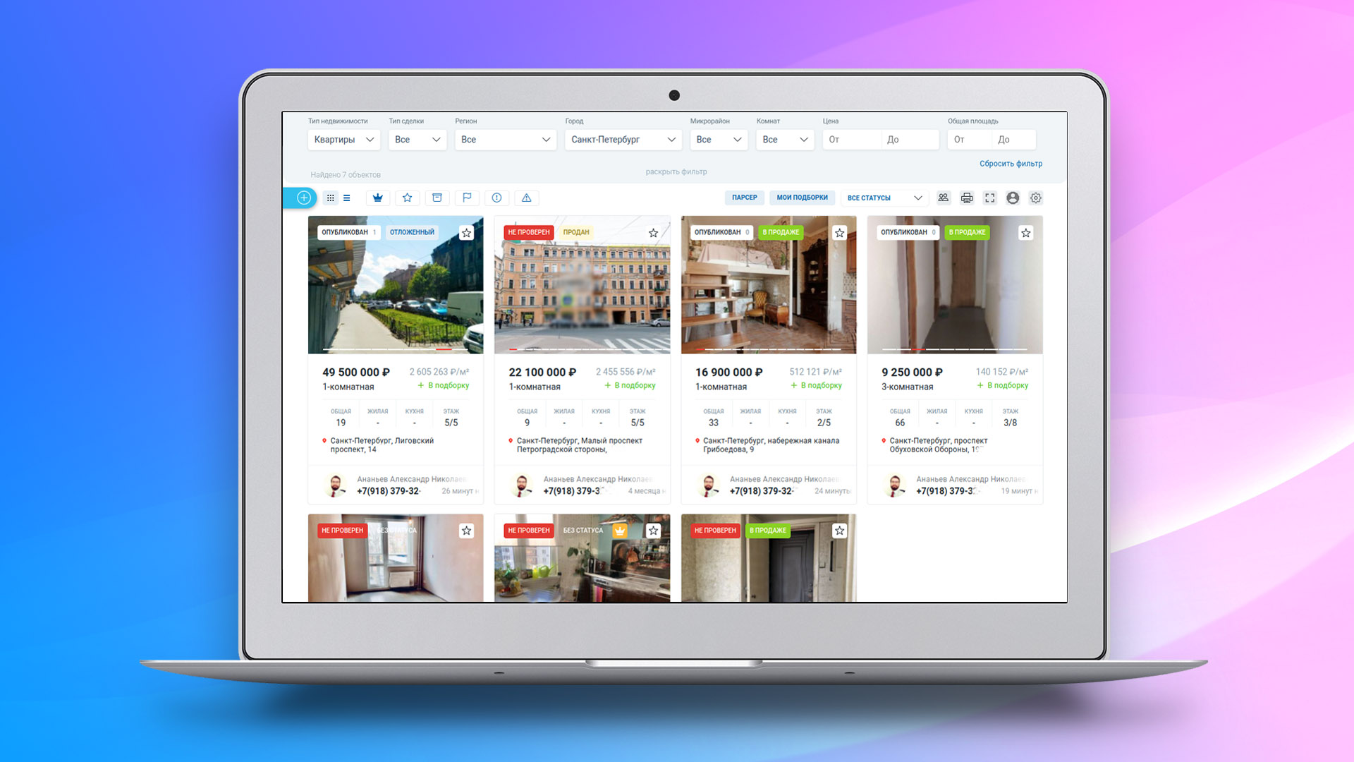 - Ведите свою базу недвижимости или добавляйте из парсера объявлений.