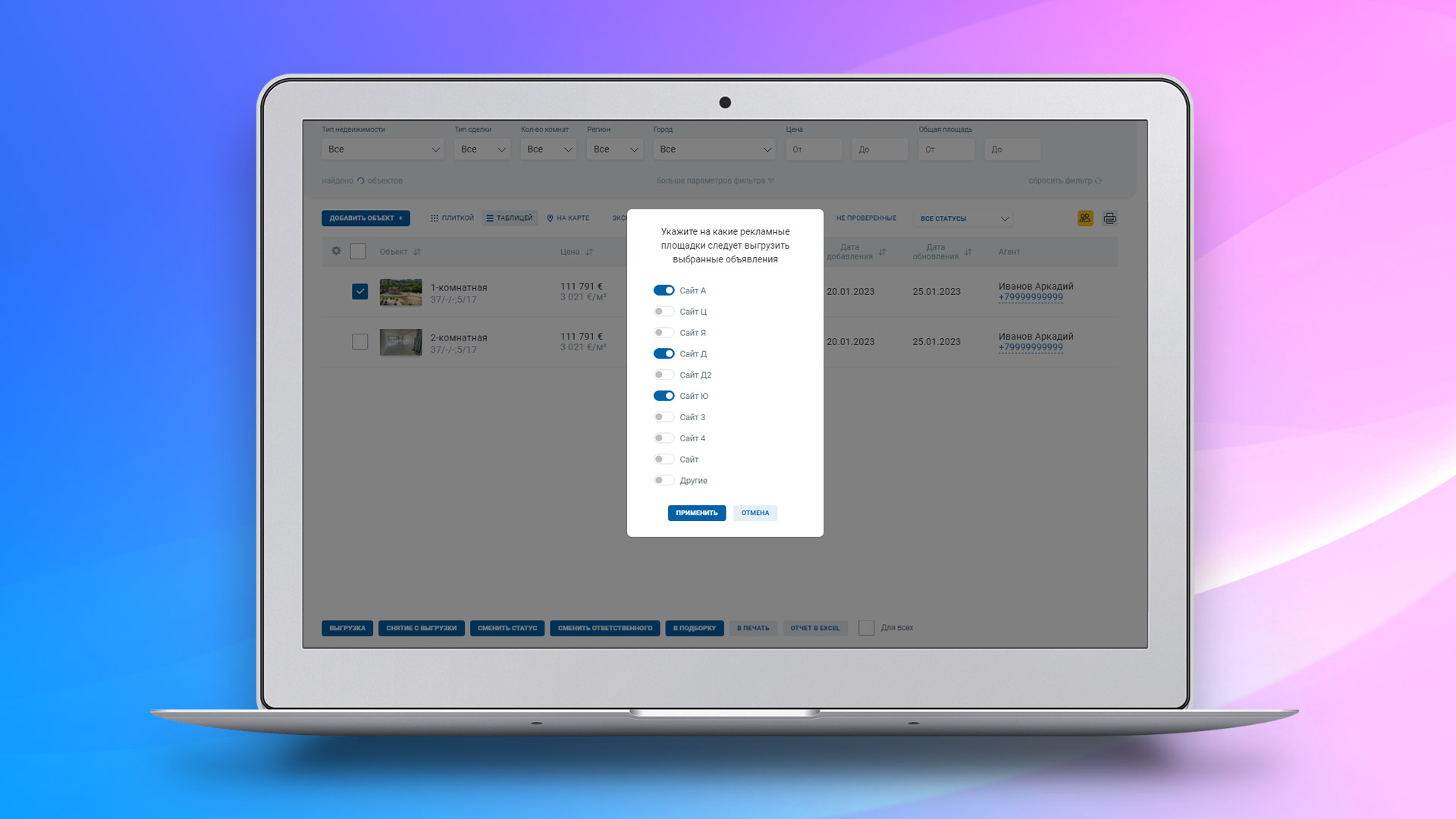 - Публикуйте объявления на рекламные площадки в 2 клика.