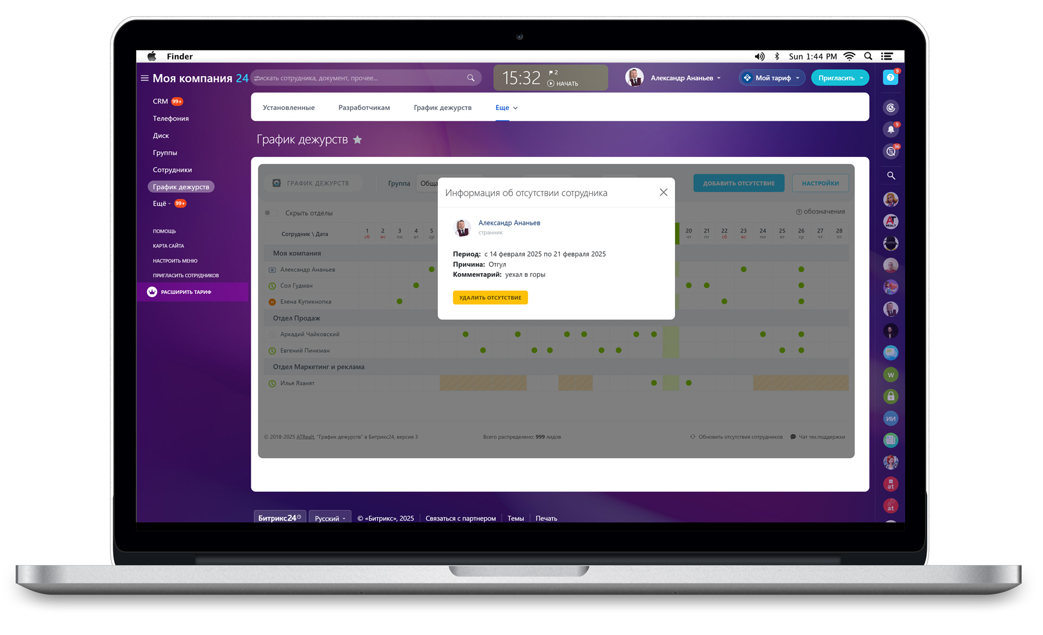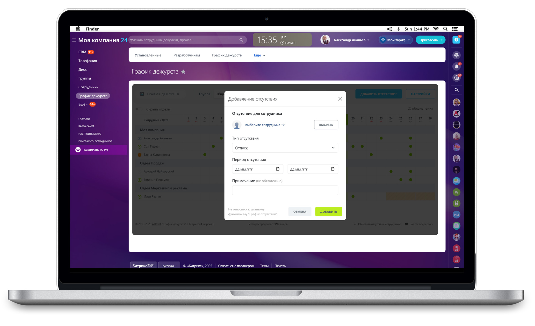 В графике можно добавлять отсутствия сотрудников, а так же отображать уже существующие отстутствия из штатного функционала "График отсутствий". Сотрудники могут видеть в какие дни и кто отсутствует.