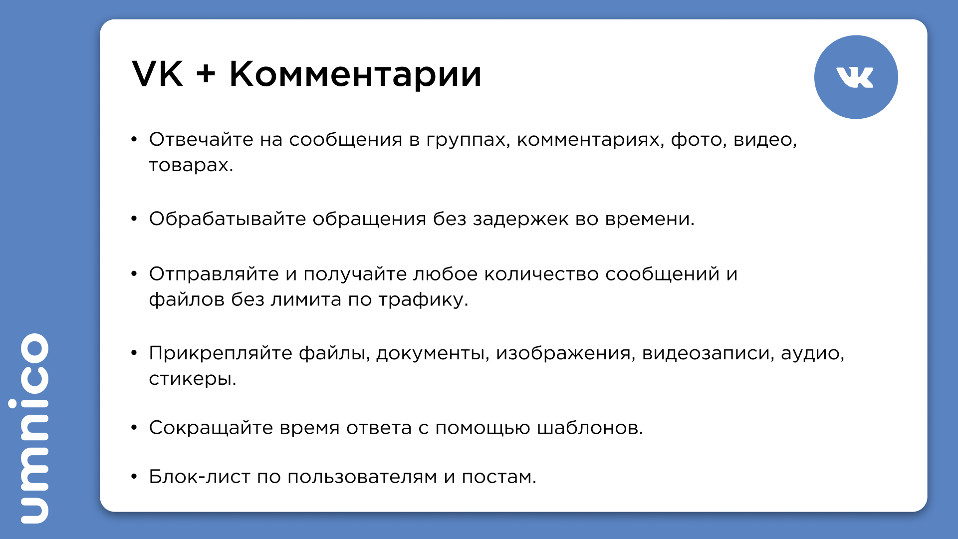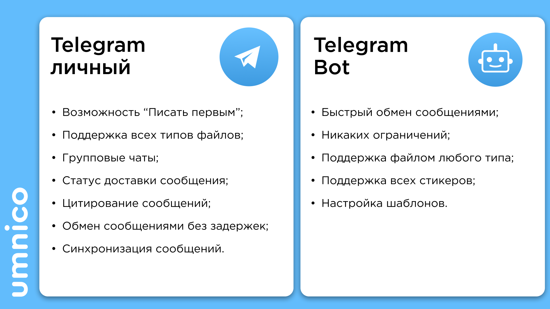 Другие преимущества Umnico:- Полный безлимит на обмен сообщениями и файлами