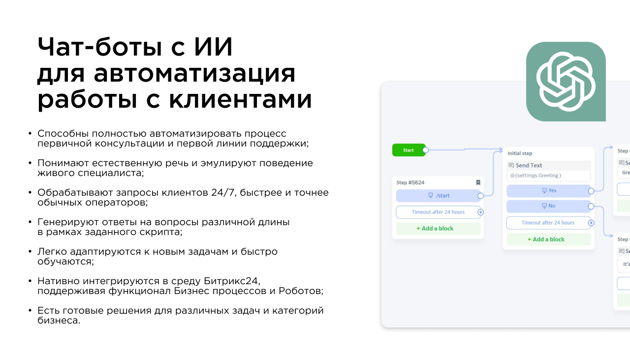 Чат-боты на основе ИИ (GPT-3.5 / GPT-4) помогут полностью автоматизировать переписку с клиентами, отвечать на типовые вопросы и даже доводить покупателей до оплаты без участия живых специалистов.
