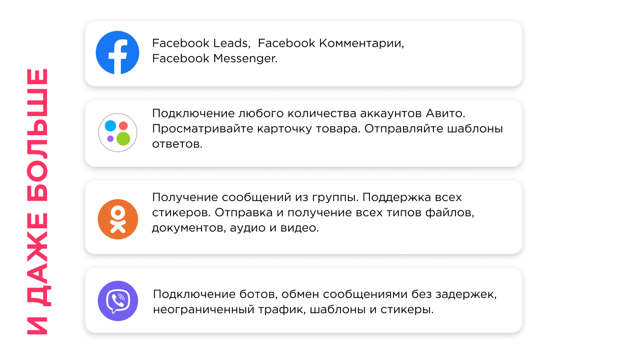 Установив приложение Umnico для Битрикс24, вы получите самый большой набор поддерживаемых мессенджеров и социальных сетей для Битрикс24, включая: