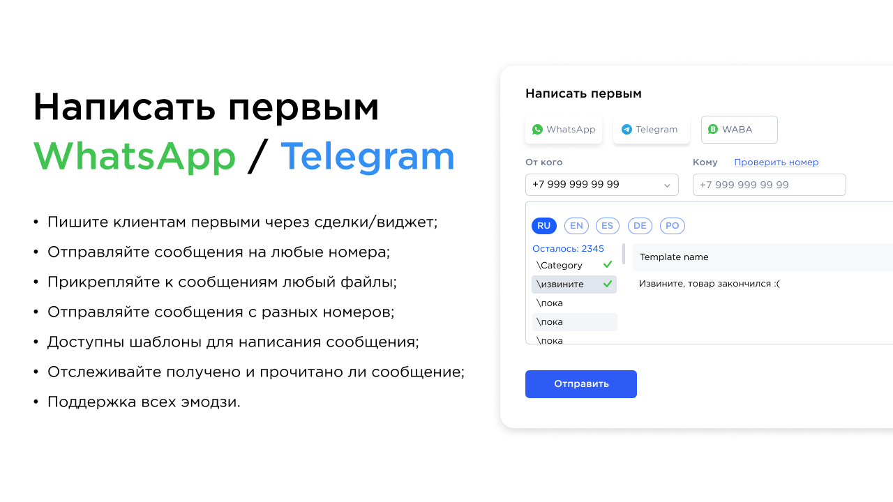 “Adiós” потерянным клиентам и недозвонамЕсли продавцы или поддержка не дозвонилась до клиента, ему можно будет написать первым в Telegram, WhatsApp из любой сделки/лида, по любому номеру и нику в мессенджере. А функция статуса доставки сообщения поможет понять прочитано ли оно клиентом.
