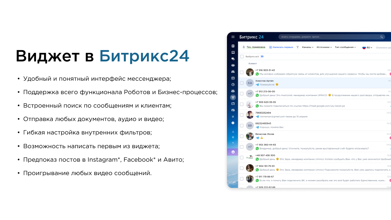 - Мультифункциональный виджет с дублированием всех диалогов, с поддержкой всего функционала мессенджеров и собственным поиском