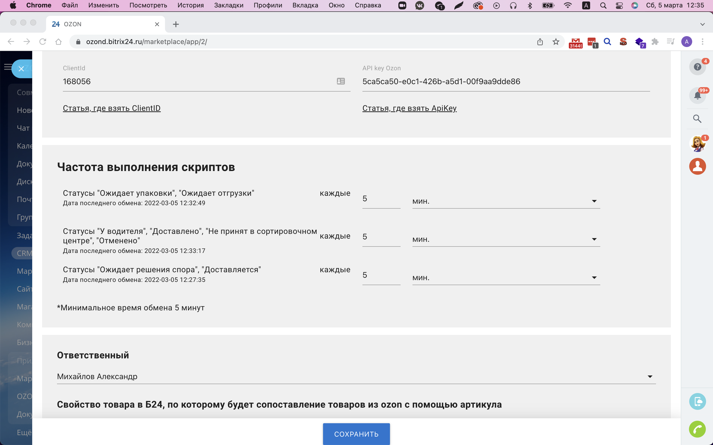 - Статусы по rFBS отправляются в OZON при изменении их в б24. (Статусы: Ожидает отгрузки, Доставляется, Доставлено, Последняя миля)
