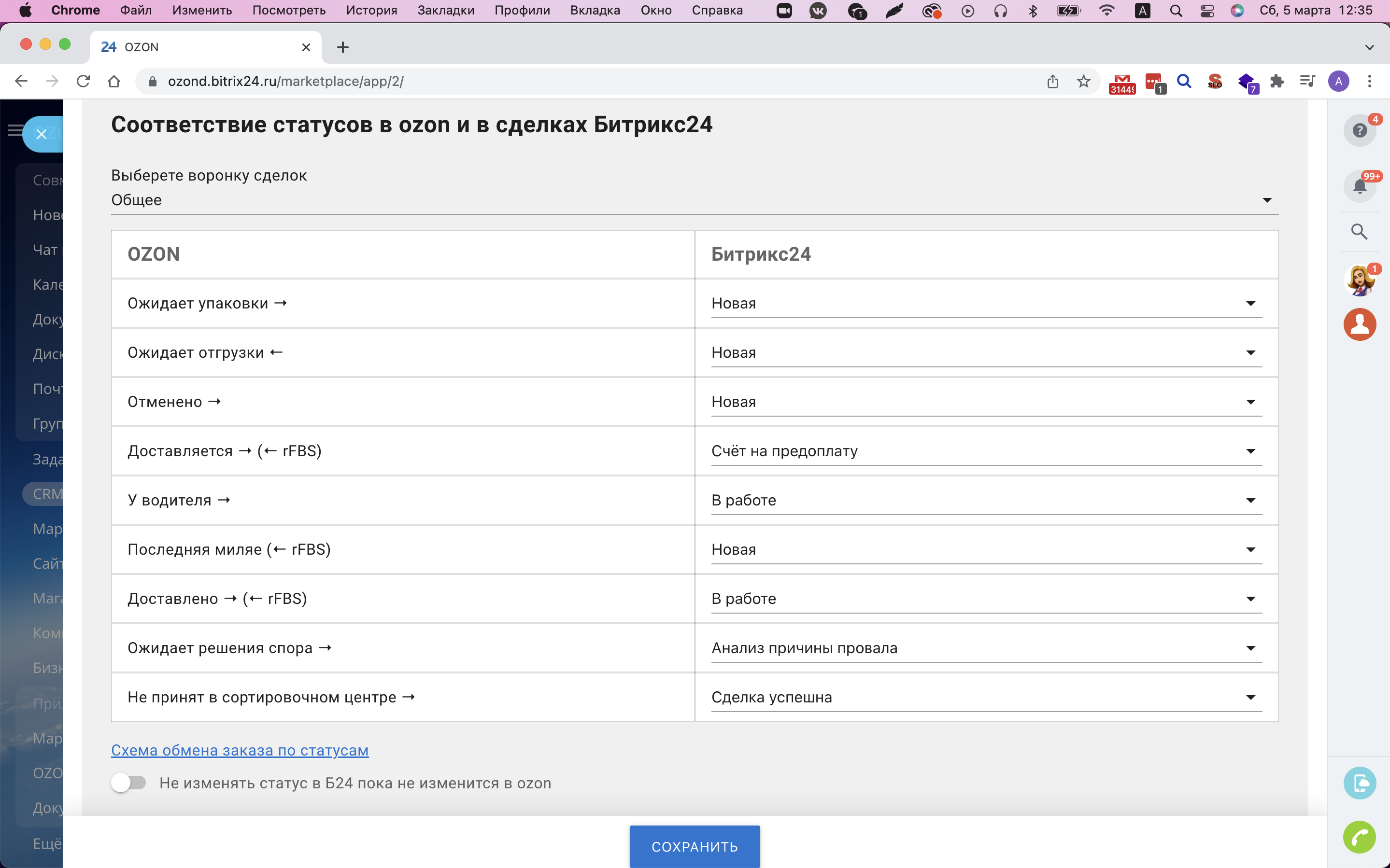- Управлять статусами заказов из Битрикс24(для rFBS)