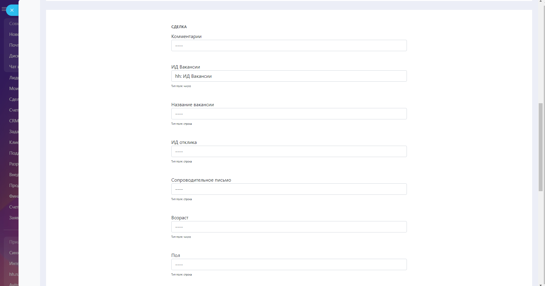 Вы можете настраивать необходимый набор полей для автоматизации и распределения данных из резюме в ваши карточки CRM системы. Каждое значение отправляется в нужное вам поле. Также можно настраивать и разные воронки. Отклики поступают моментально.