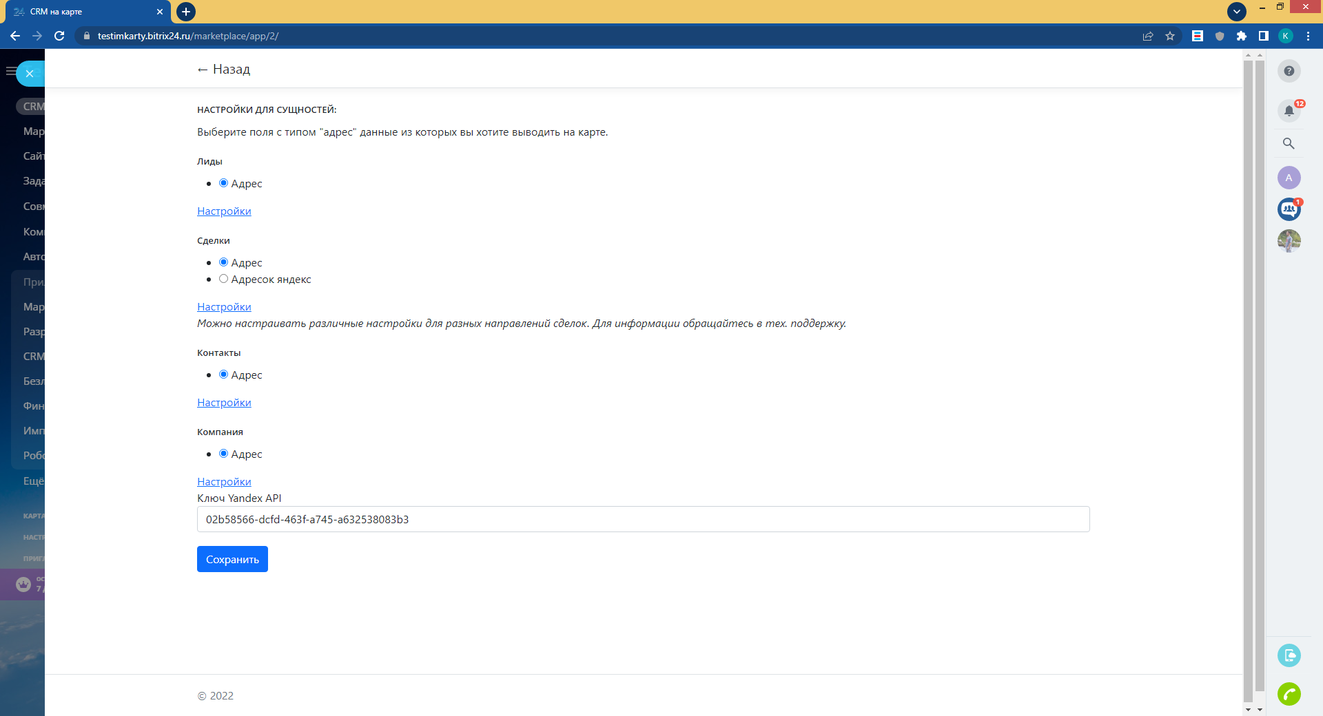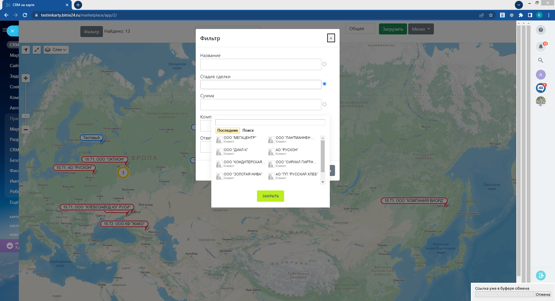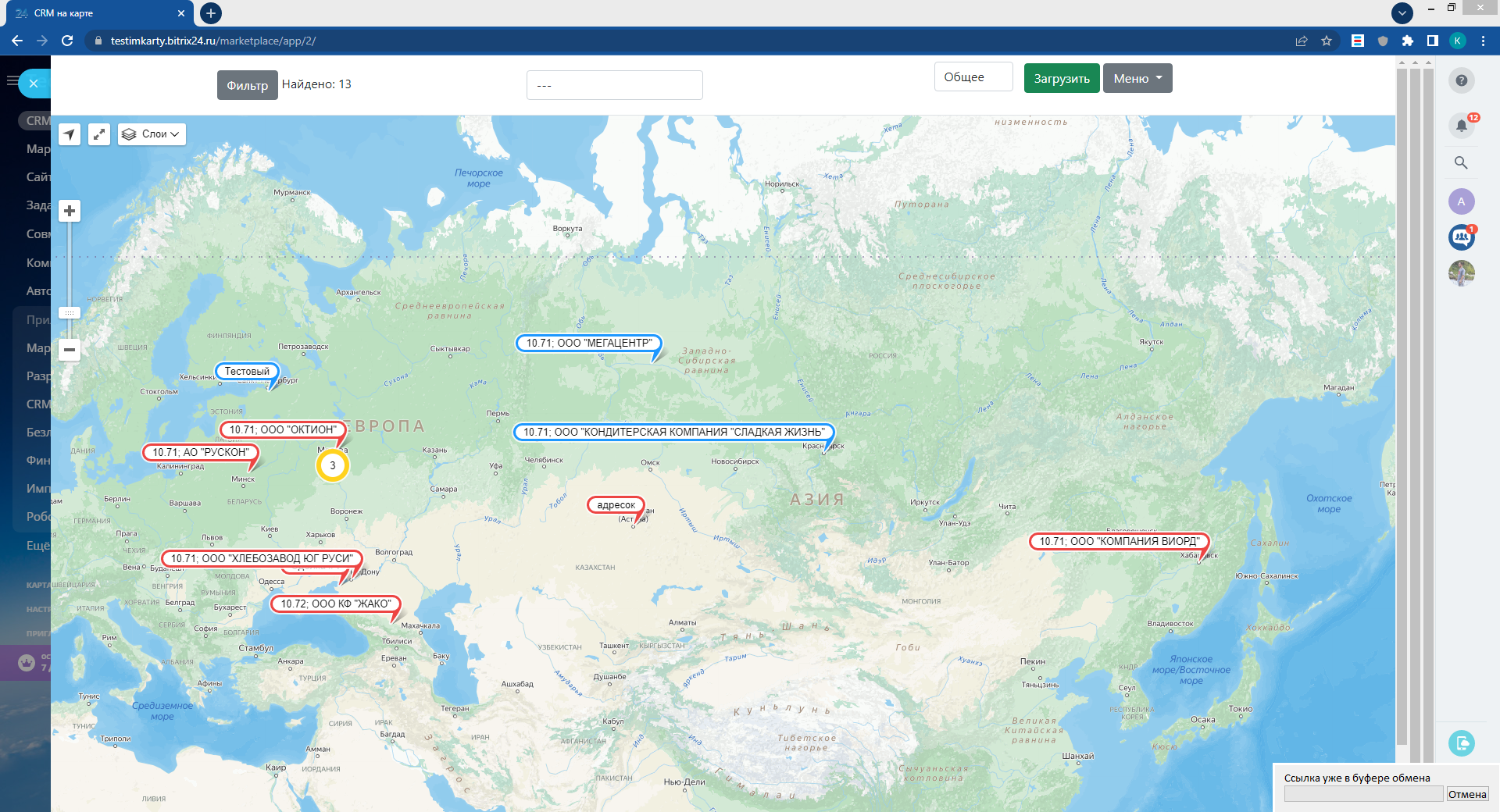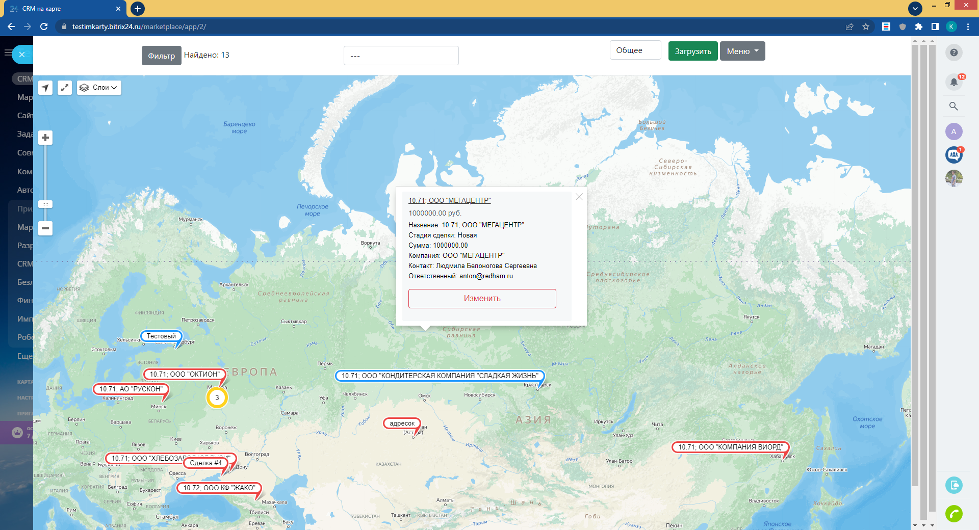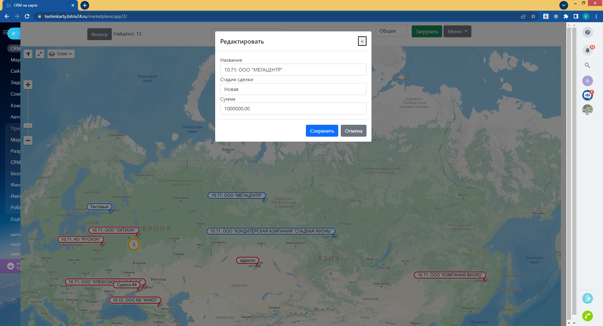 Приложение позволяет отображать лиды, сделки, контакты и компании на карте.