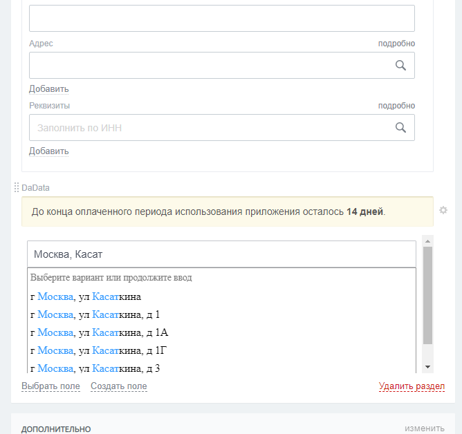 - Пользовательский тип "Адрес DaData". Позволяет вводить адрес с подсказками;