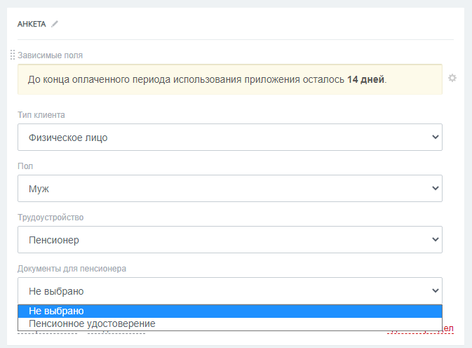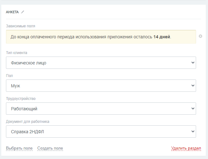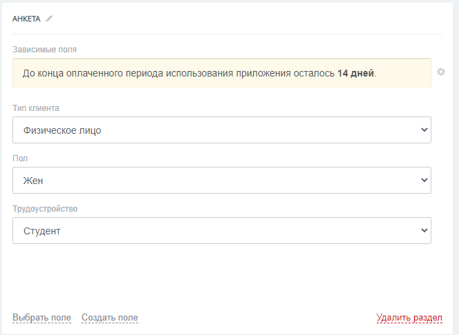 Вы можете задать, при каком значении одного поля должны запрашиваться дополнительные поля у менеджера. Количество таких полей не ограничено* — достаточно выбрать начальное поле, с которого начинается логика заполнения.