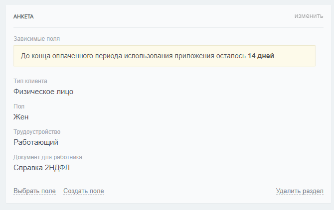 Внимание: для корректной работы приложения поля, используемые в приложении, должны быть добавлены в карточку