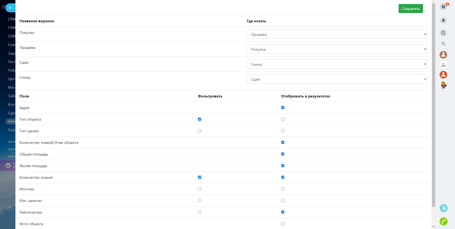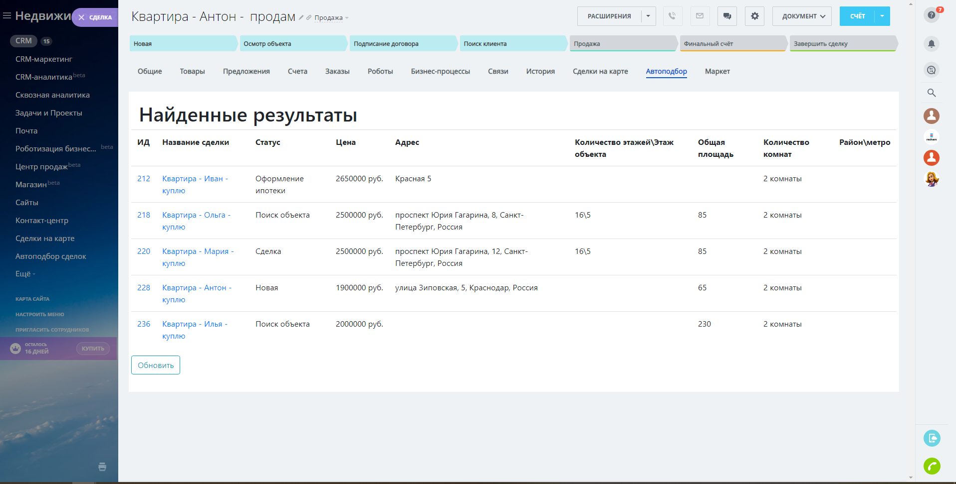 В воронке продаж "Покупка" в сделке Иван Иванович, который планирует приобрести 1-ю квартиру в центральном районе города на сумму не больше N, будет автоматически подгружены предложения из воронки "Продажа" с выбранными параметрами объекта).