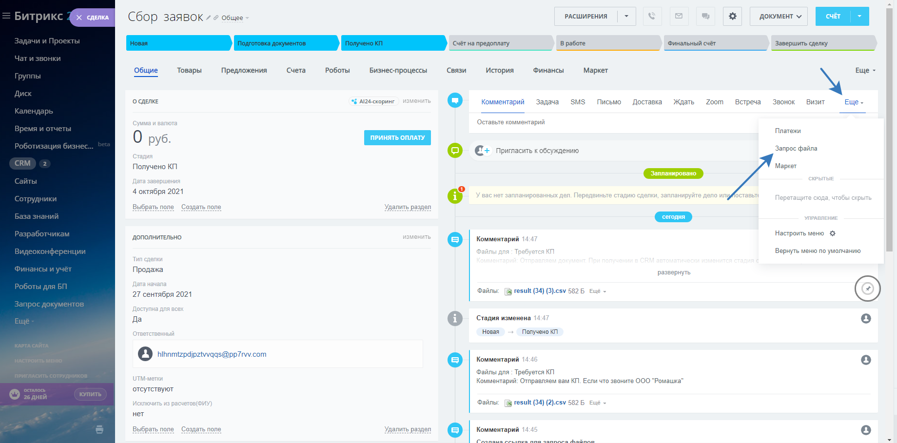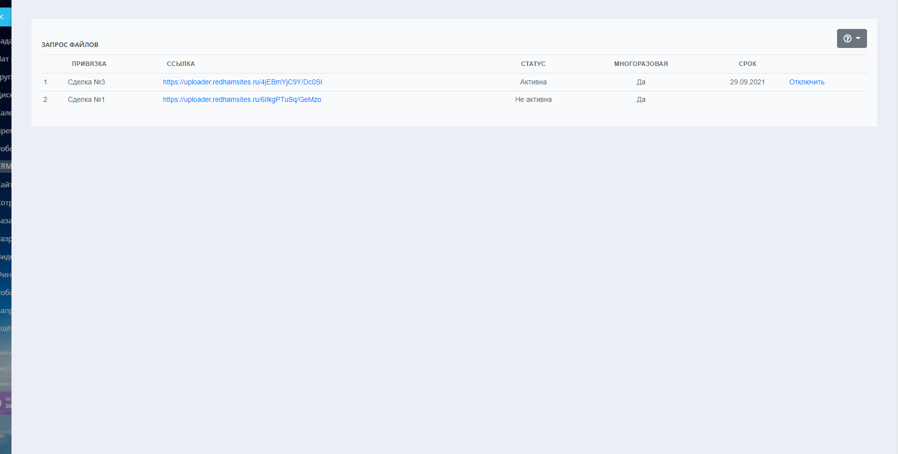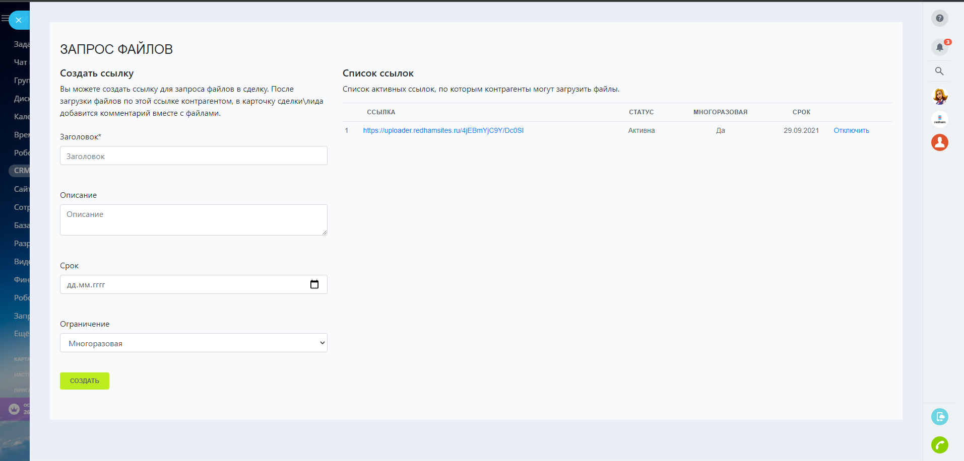 1) Срок. После истечения срока файлы больше не будут приниматься в вашу CRM. Необходимо, когда сбор предложений от поставщиков ограничен во времени;
