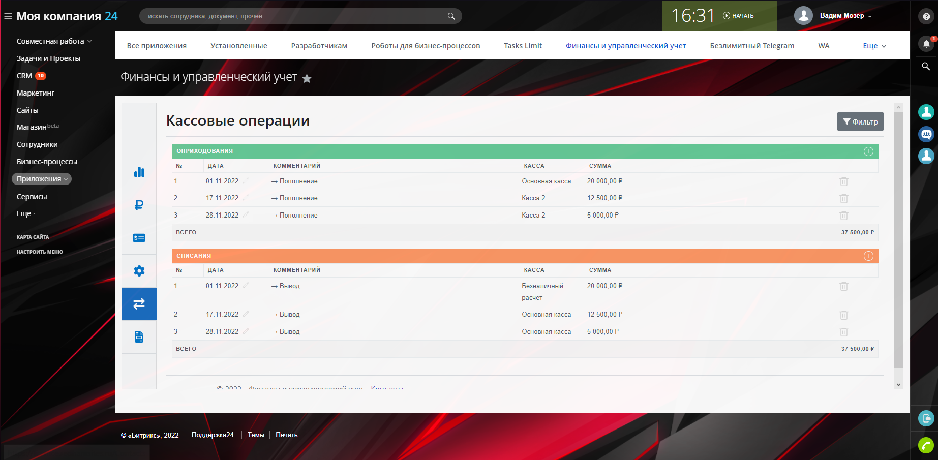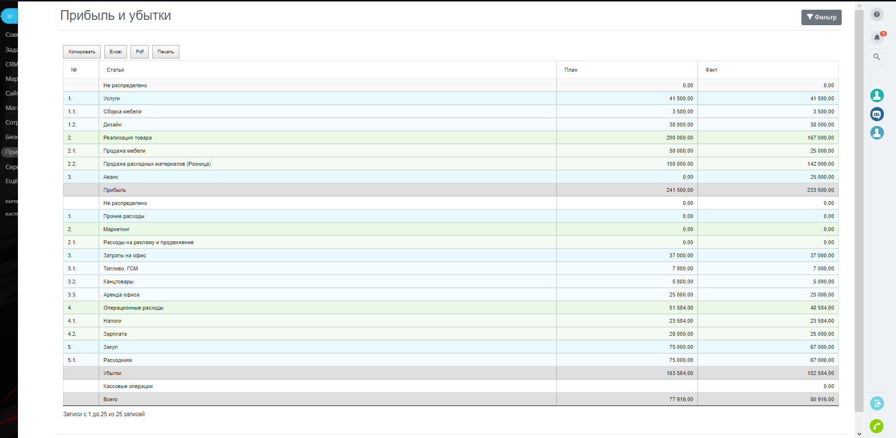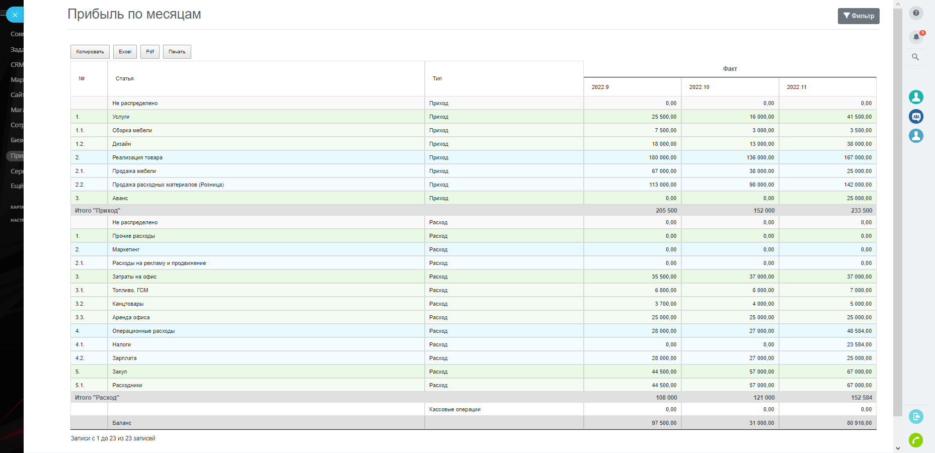 Приложение позволяет контролировать доходы и расходы внутри сделок, компании в целом и выводить информацию для управленческих отчетов.