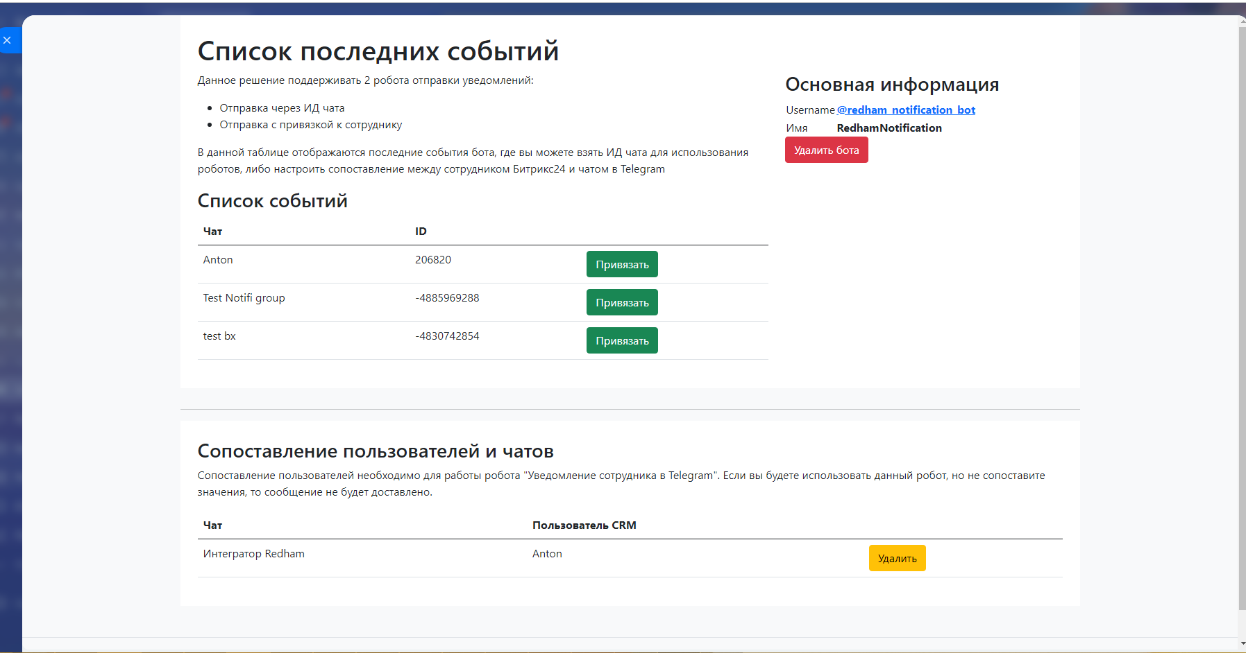 • Уведомления телеграм могут содержать кнопки с командами на изменения статуса сущности CRM в уведомлениях Telegram;