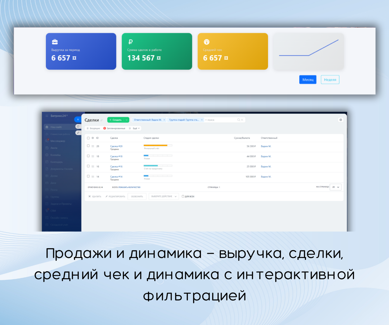 - Продажи в CRM - общее количество сделок, лиды, выручка и средний чек, прямо с возможностью открыть нужные сделки по фильтру.