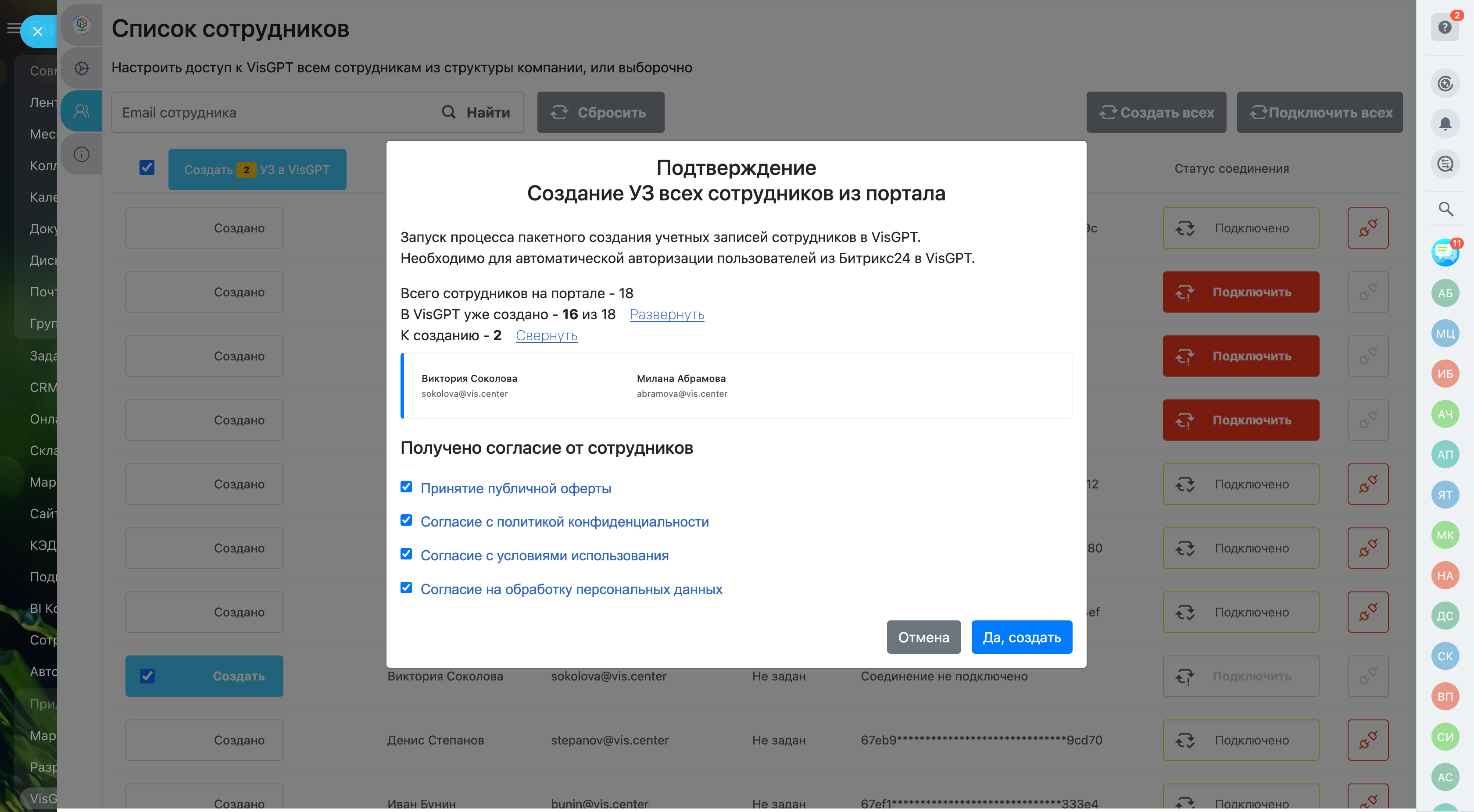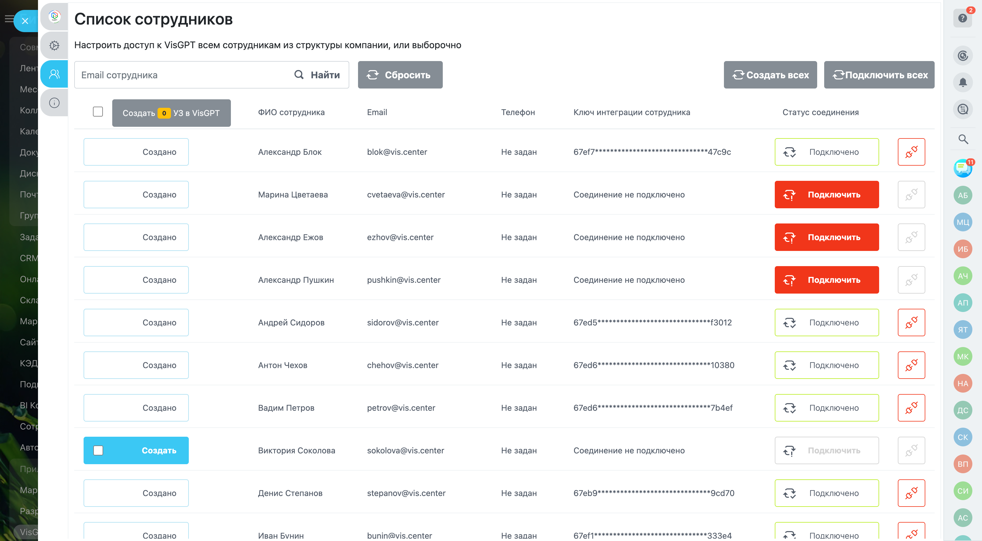 Также создать можно в личном кабинете https://gpt.vis.center/p/employees, а затем произвести подключение из приложения.