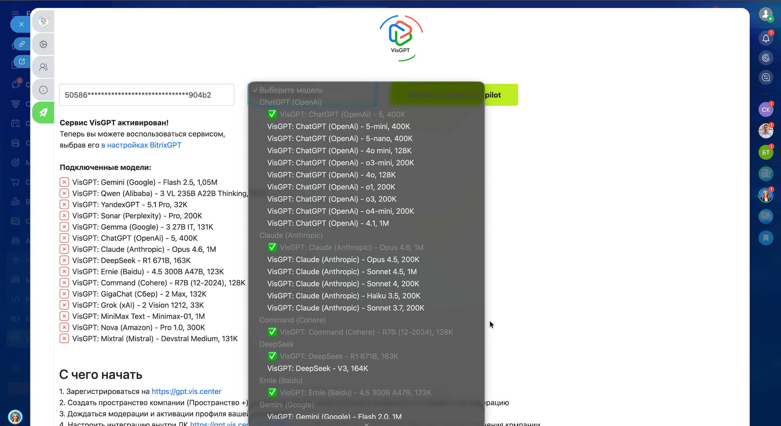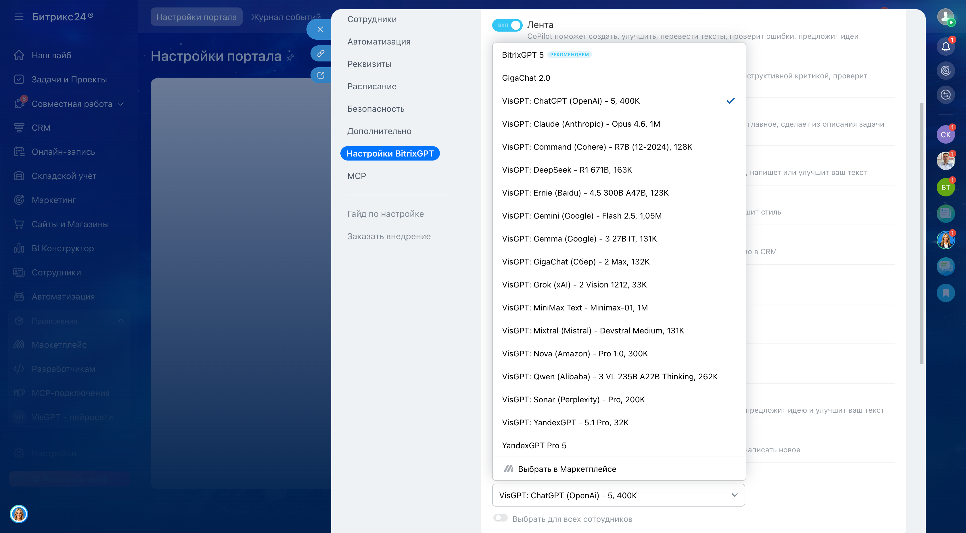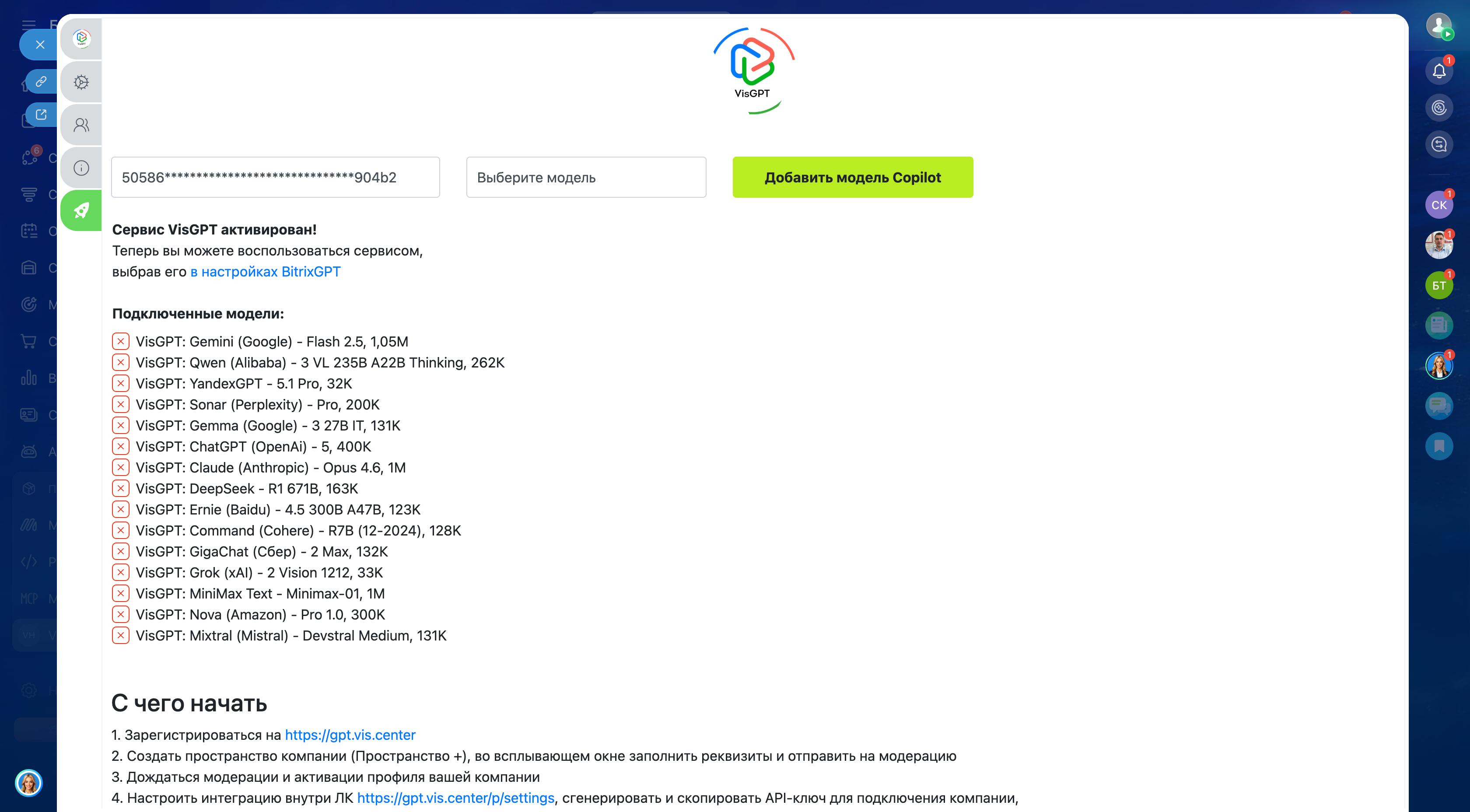 5. Выбрать добавленную модель в настройках BitrixGPT и пользоваться VisGPT в Битрикс24