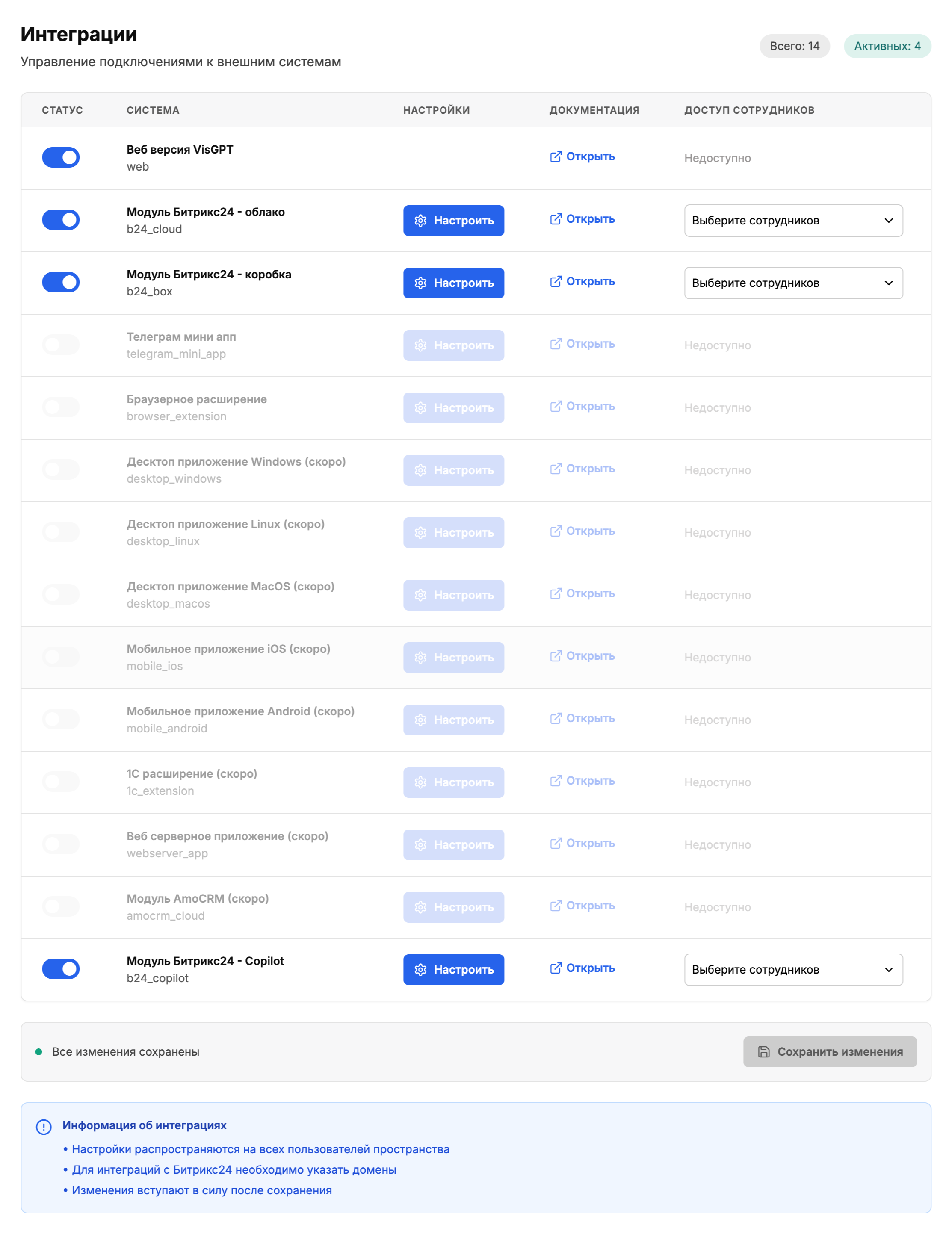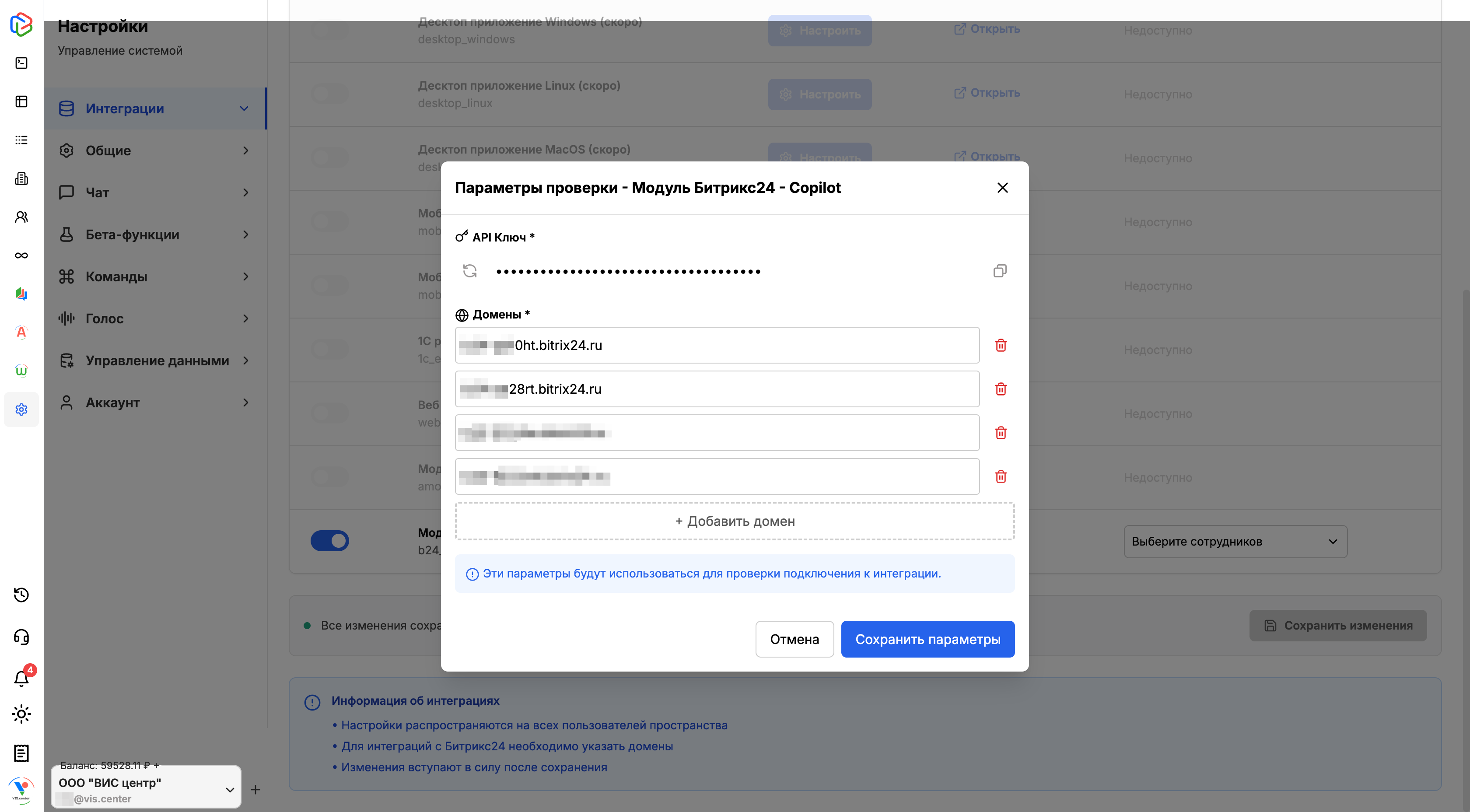 2. Настроить интеграцию внутри ЛК https://gpt.vis.center/p/settings, сгенерировать и скопировать API-ключ для подключения Битрикс24 - Copilot, указать домен Б24