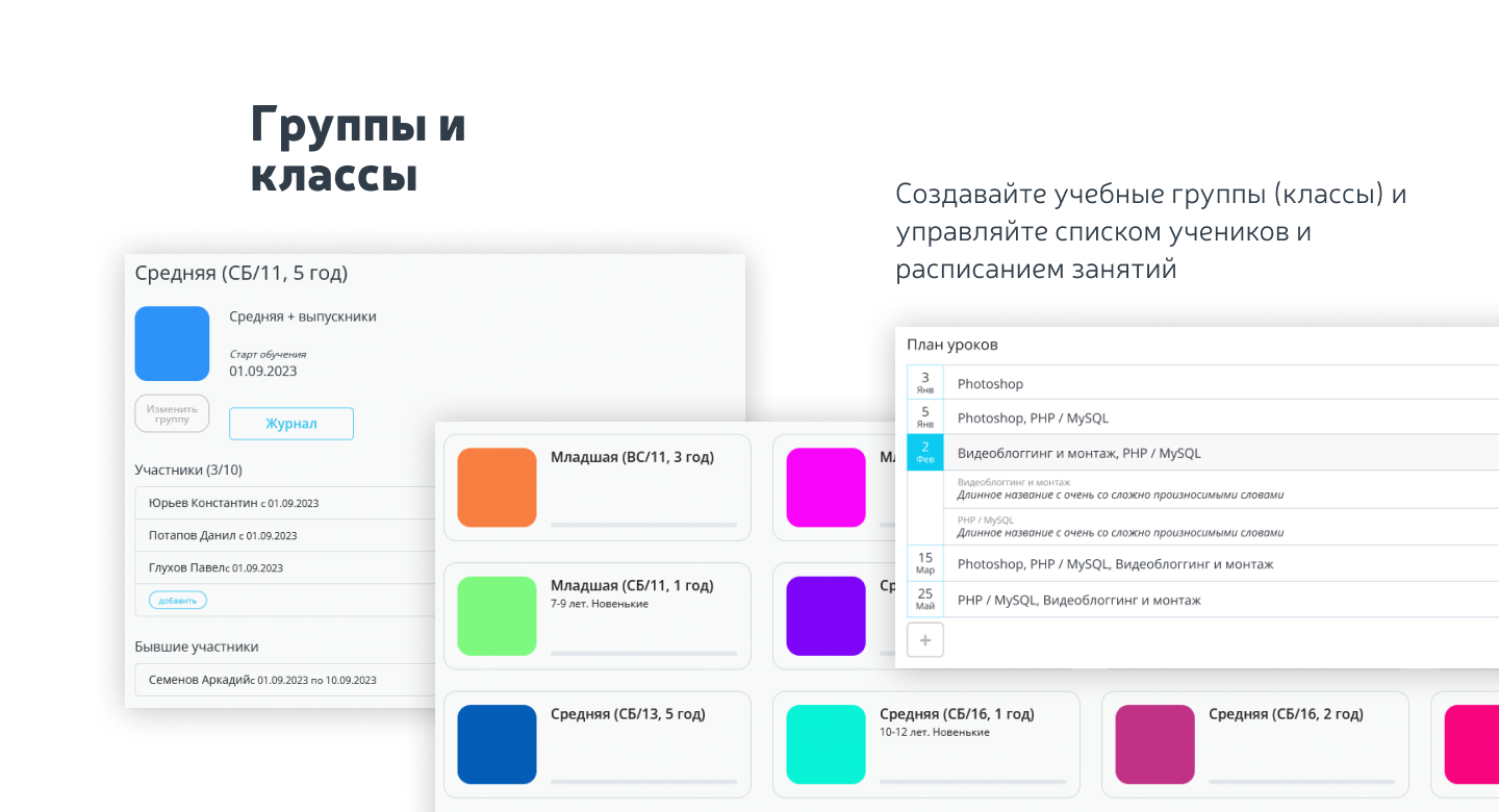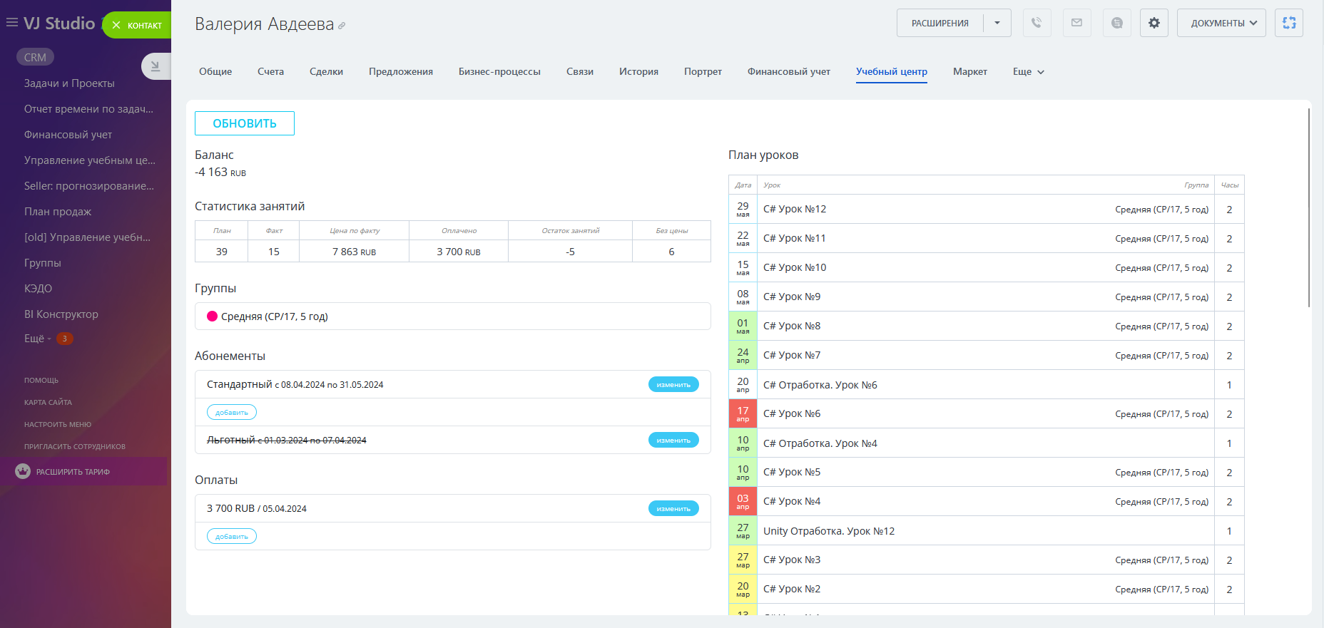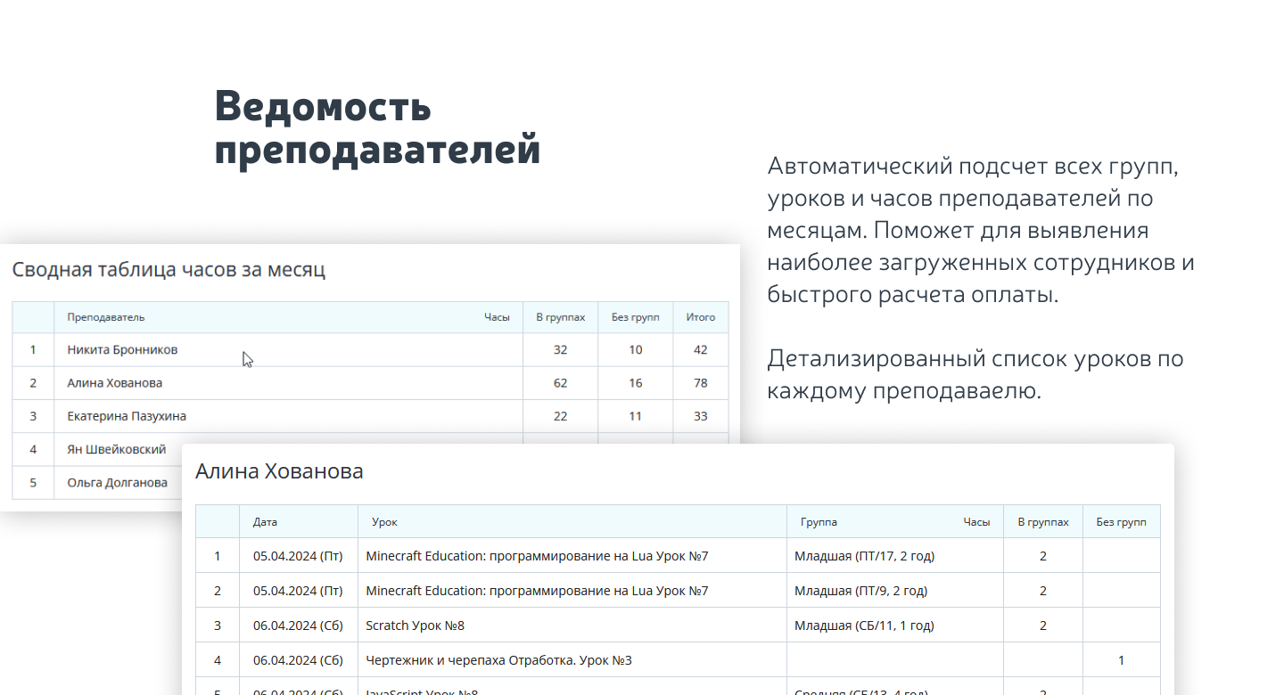 - управление посещаемостью по групповым и индивидуальным занятиям;