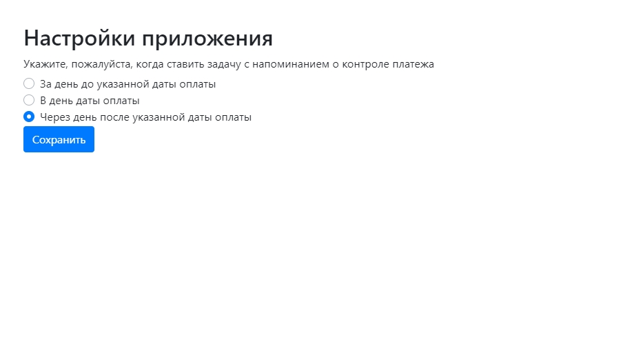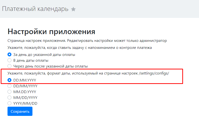 После установки приложения будут доступны две настройки. Необходимо выбрать, когда именно будет формироваться задача сотруднику о необходимости связаться с клиентом и уточнить дату оплаты. Соответственно, задача ставится за день, в день или через день от даты, указанной в поле «планируемая дата оплаты». И вторая настройка формата даты. Она должна соответствовать формату, указанному на странице общих настроек портала. Постановка задач происходит по ночам: время начала работы скрипта 01:05 по московскому времени