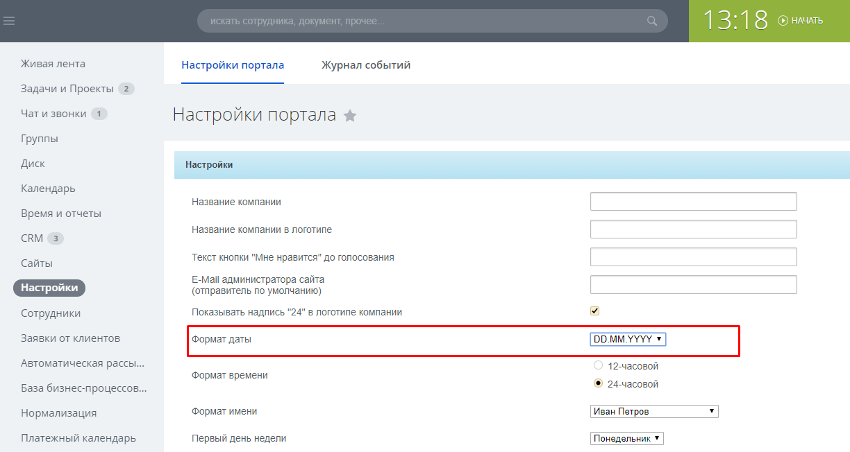 • На странице настроек портала у вас указан формат даты YYYY-MM-DD и вы не готовы изменить эту настройку (поддерживаются оставшиеся 5 форматов, см. скриншоты)
