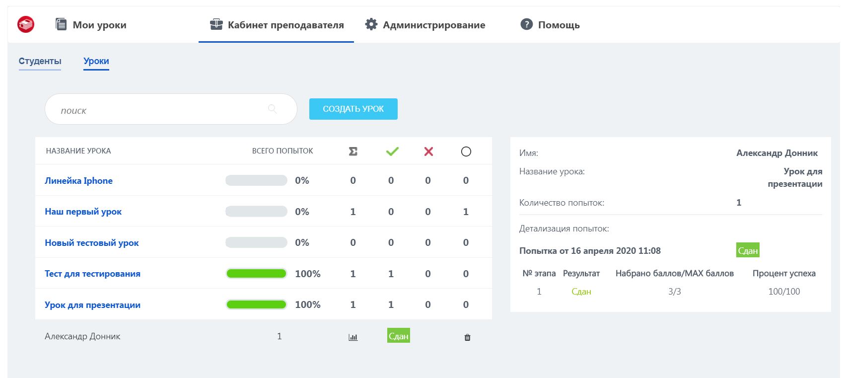 Удобная статистика дает понять, как продвигается выполнение урока у студентов.