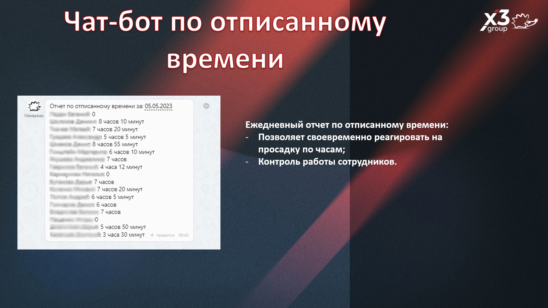 Предоставит ежедневный отчет по отписанному времени, чтобы вы могли оперативно отреагировать, на сокращение отписанного времени и выяснить в чем причина.