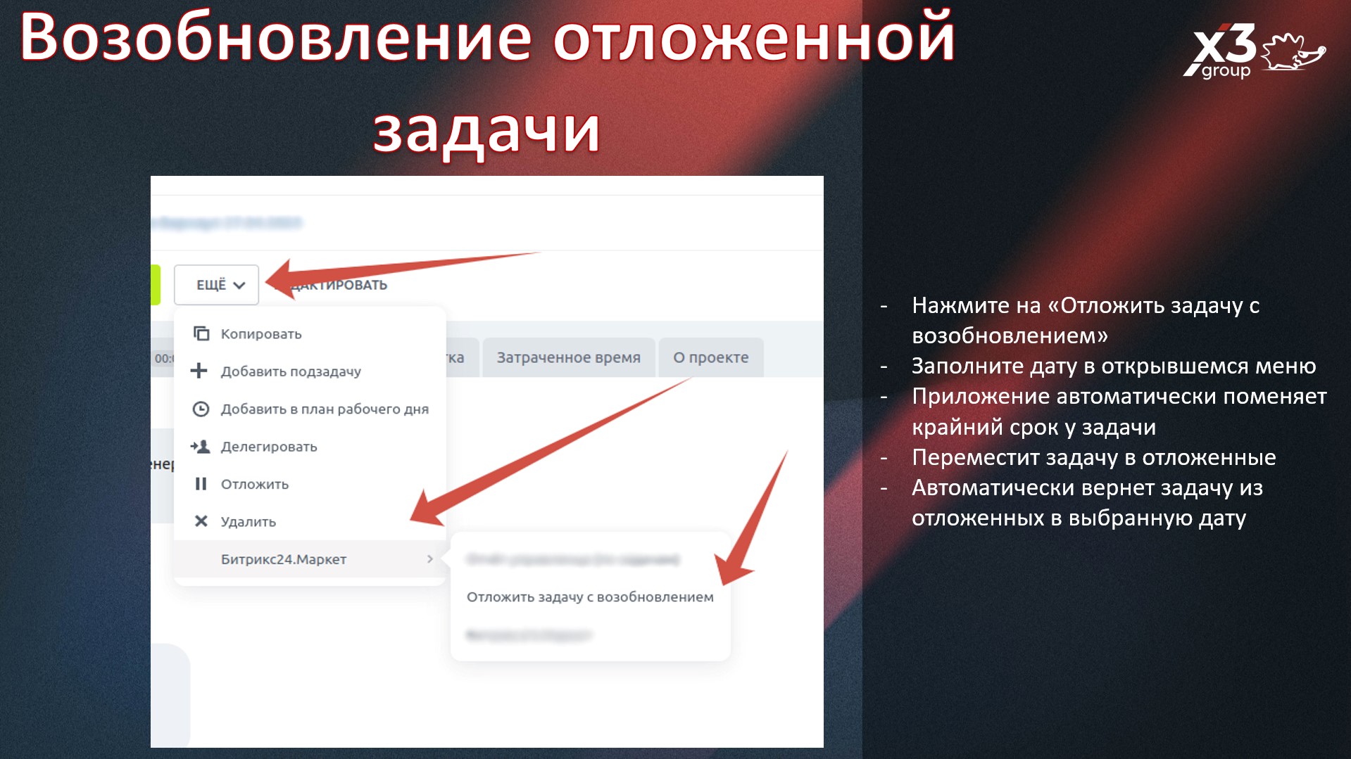 Возобновление отложенной задачи в указанный срок.