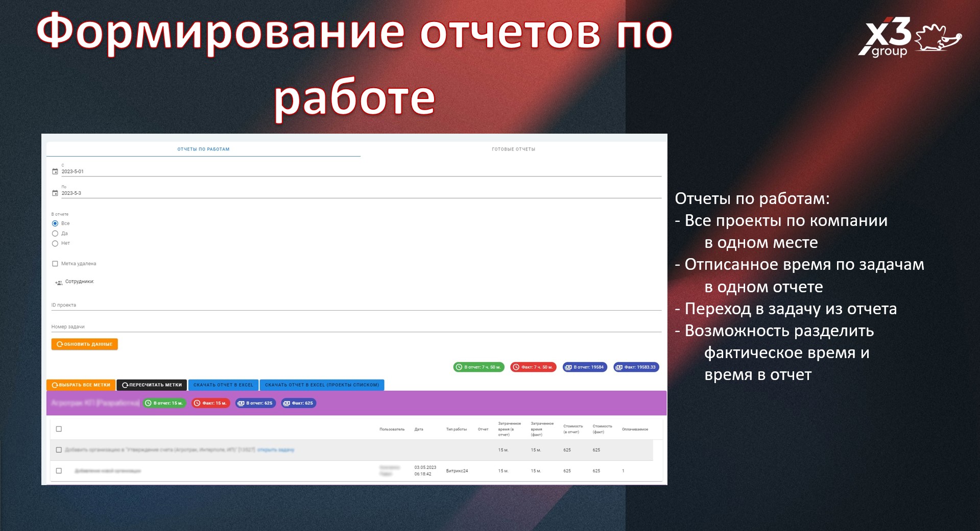 1) Интегрирует отписанное время(Отписанное время - это время, которое сотрудник отписывает на выполнение задачи. Иными словами отписанное = затраченное время сотрудником на выполнение задачи, которое он "отписывает" в специальном блоке, задач) в отчет: