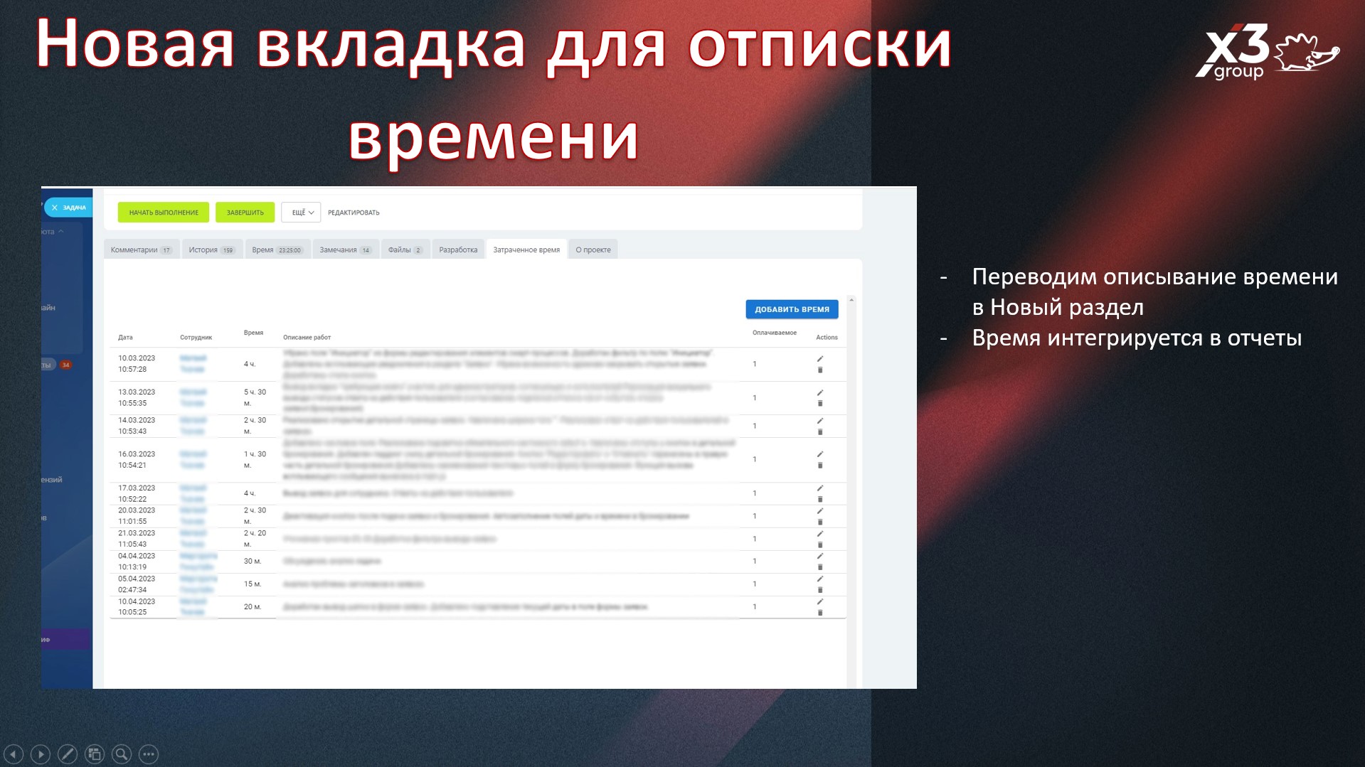 В задаче добавляется отдельная вкладка через, которую будет производиться указание затраченного времени сотрудниками. Приложение будет учитывать указанное время при формировании отчетов и выводить их в отдельной графе.