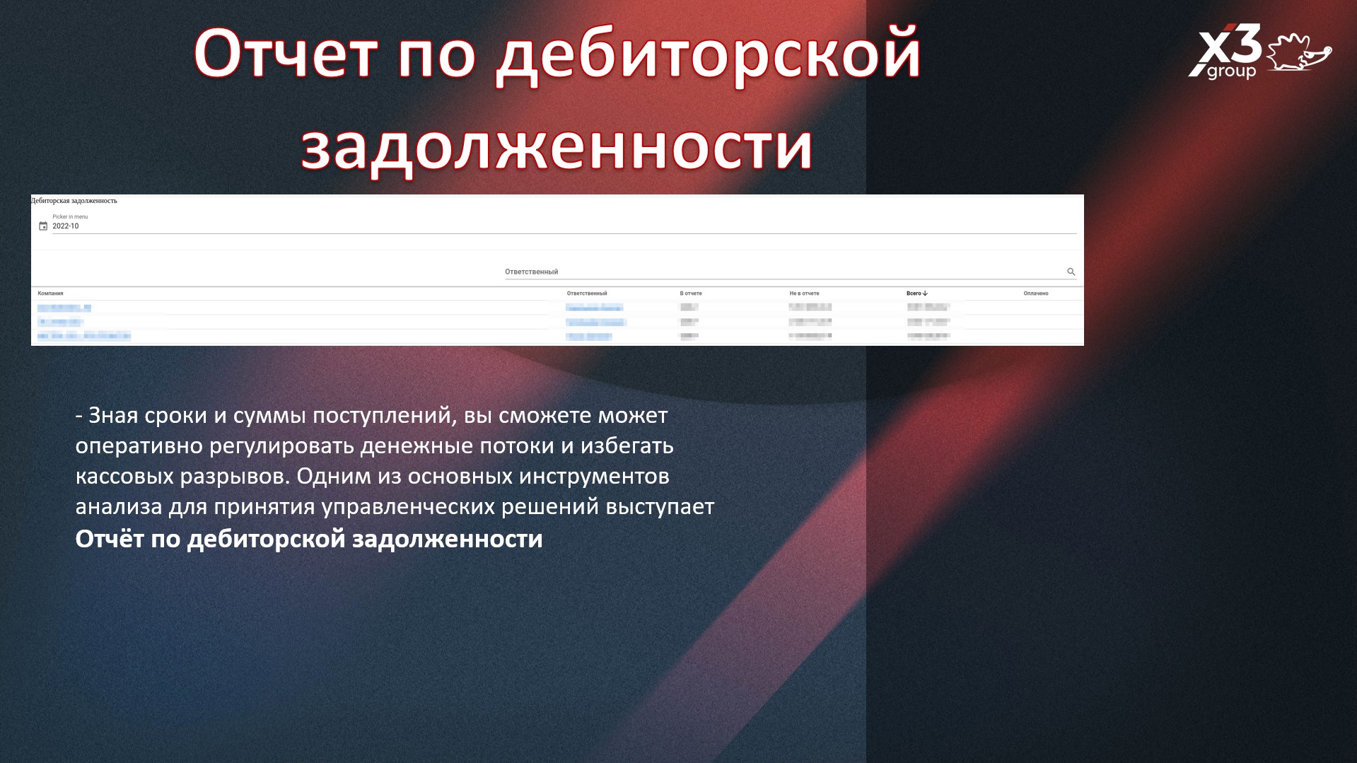 Дебиторская задолженность: покажет состояние дебиторской задолженности по компаниям;