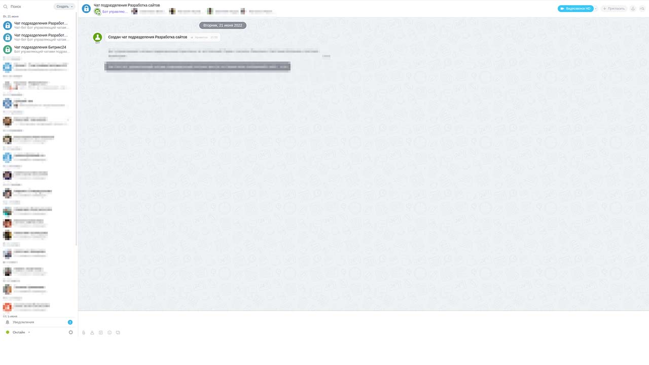 Если же у подразделения нет рабочего чата, но он нужен – администратор портала Битрикс24 сможет создать чат для подразделения и автоматически добавить всех сотрудников подразделения в беседу.
