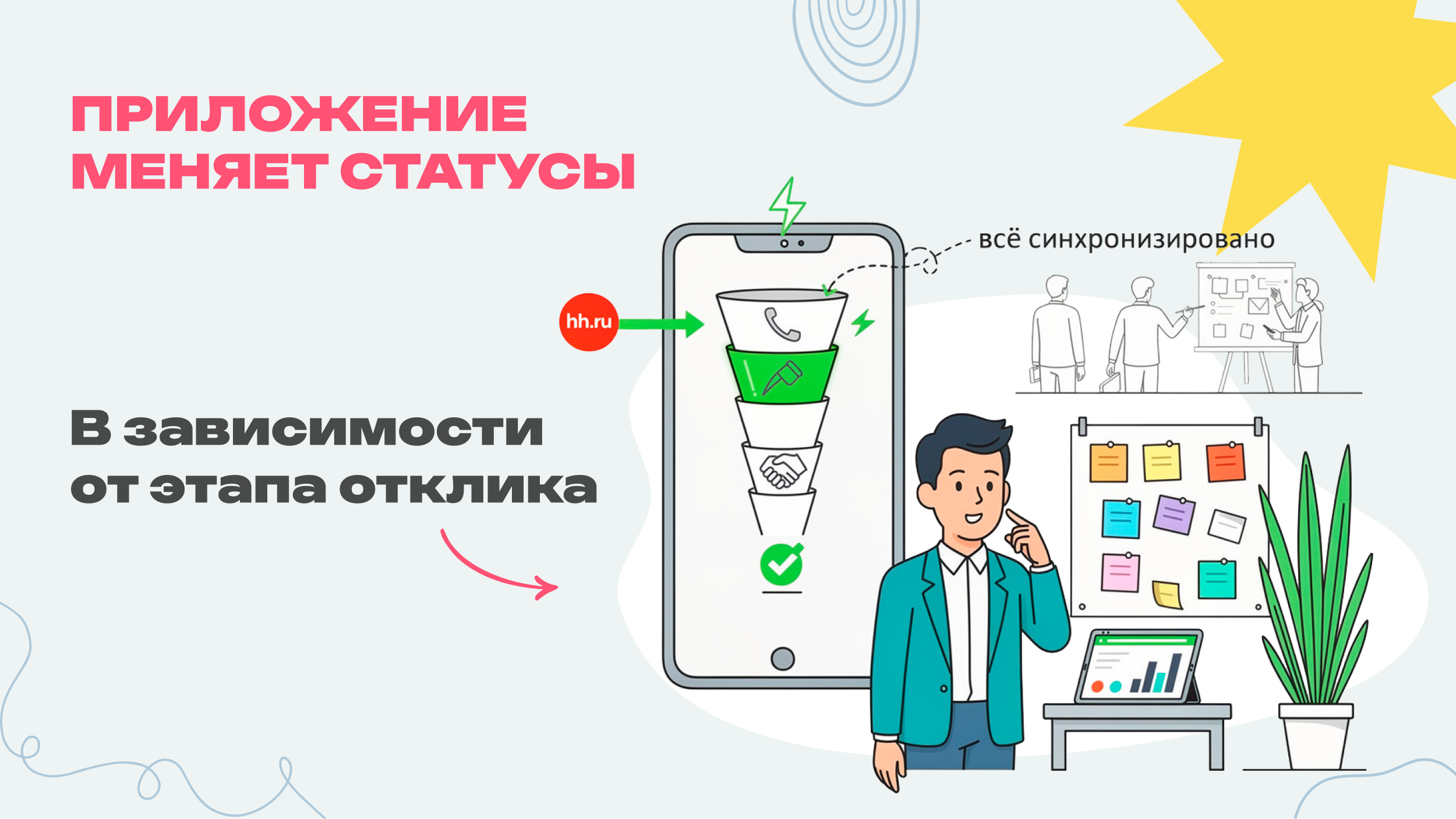 • Меняет статусы в зависимости от этапа отклика.