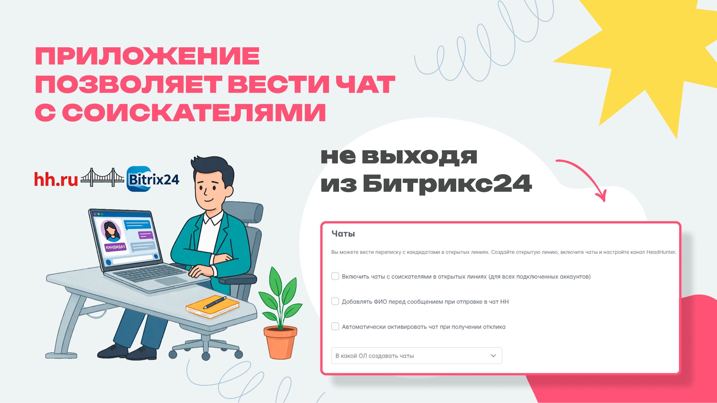 • Позволяет вести чат с соискателями не выходя из Битрикс24.