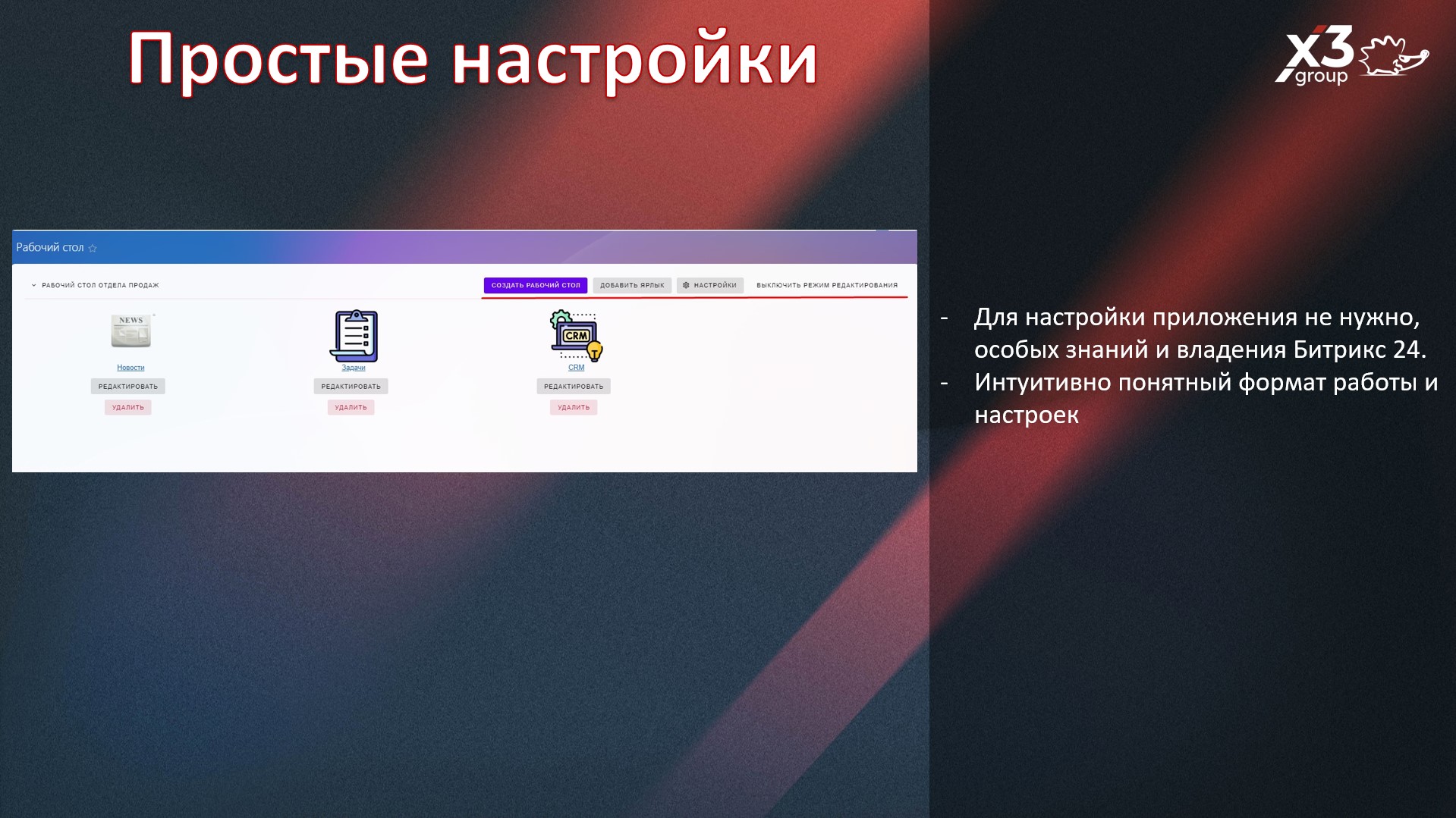 - Приложение позволяет создать и настроить Рабочие столы (стартовые страницы) для ваших сотрудников и вынести в них необходимые разделы портала.