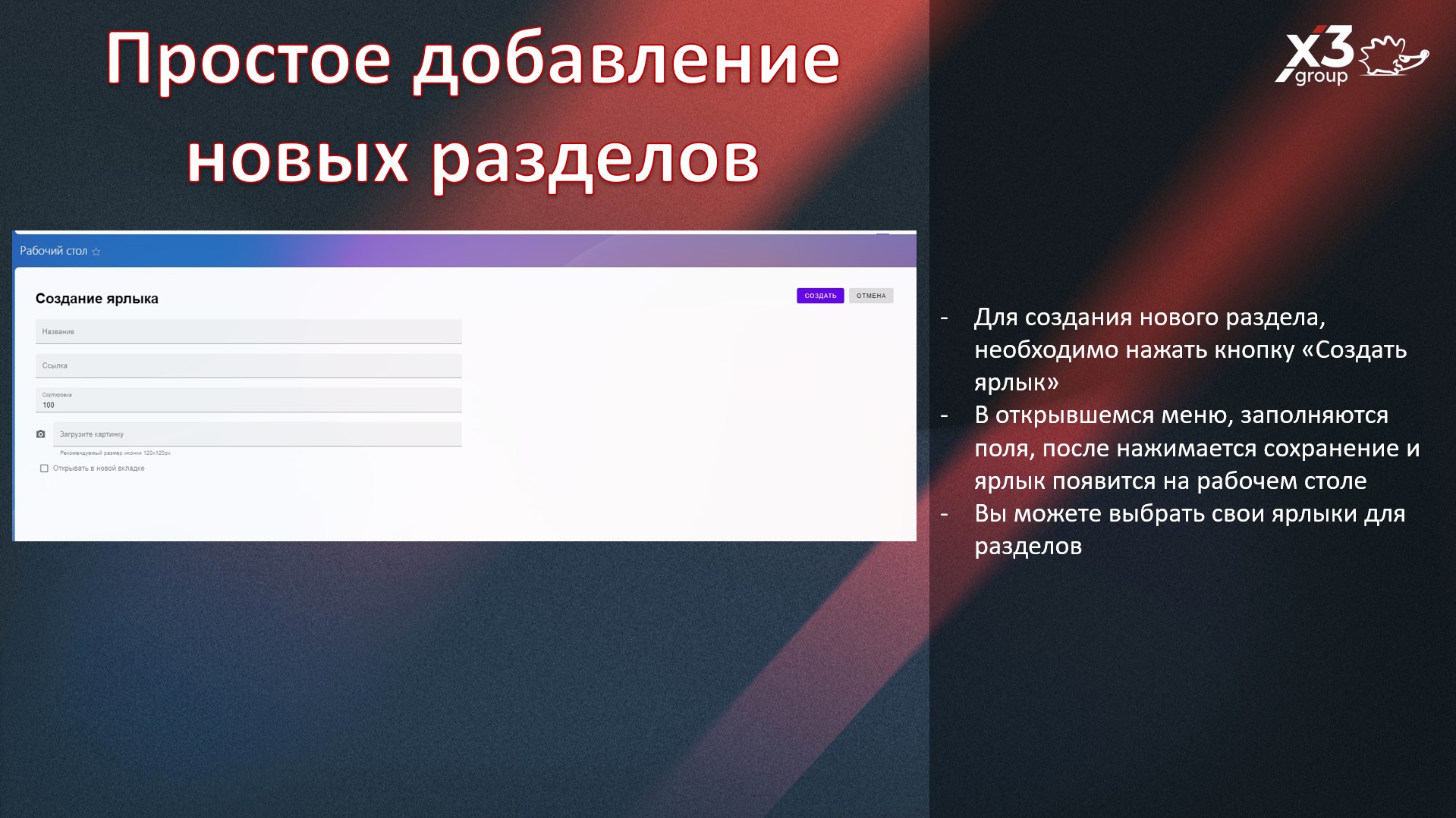 - Вы можете добавлять иконки на рабочий стол, устанавливать на них внешние и внутренние ссылки.