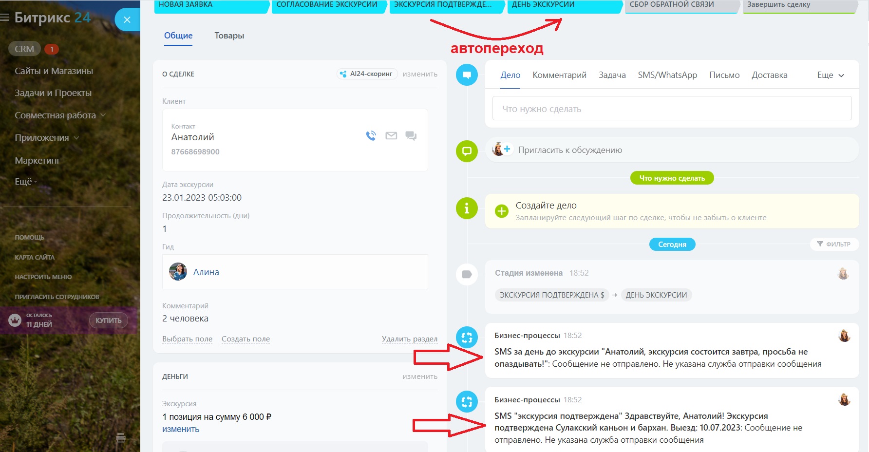 CRM система для туризма и экскурсий помогает работать с клиентами в автоматическом режиме. WhatsApp и смс сообщения удерживают клиента и фокус внимания на вашей компании.