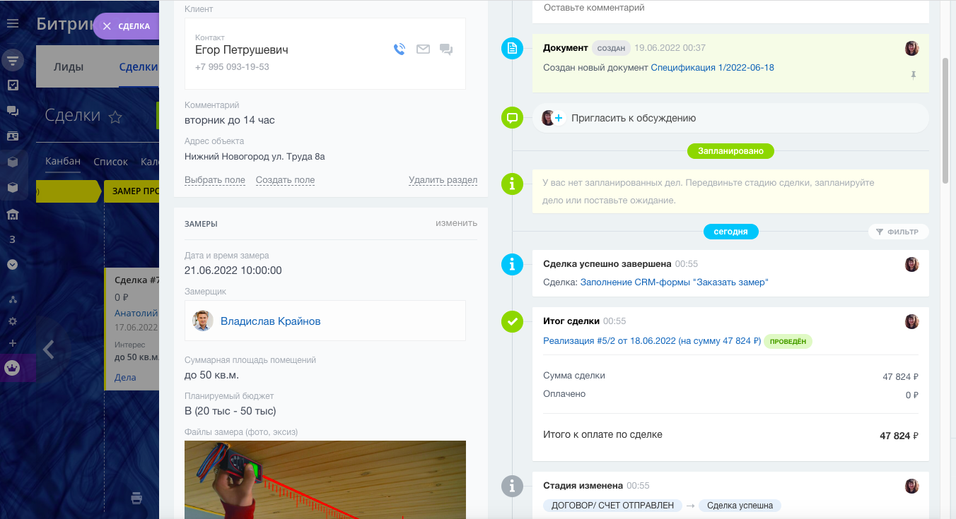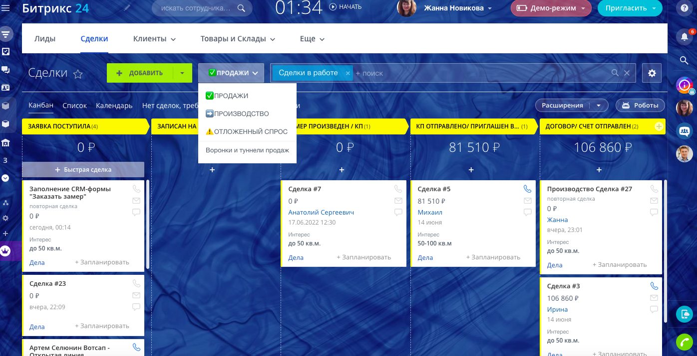 Готовая ЦРМ для сферы натяжных потолков. Продуманы сценарии автоматизации как для менеджеров, так и для клиентов. CRM Натяжные ПОТОЛКИ отвечает всем современным требованиям и задачам. Реализованы сценарии как продажи, монтажа и замера натяжных потолков, так и сервисное дополнительное обслуживание. Включает в себя все последние новинки Битрикс24.