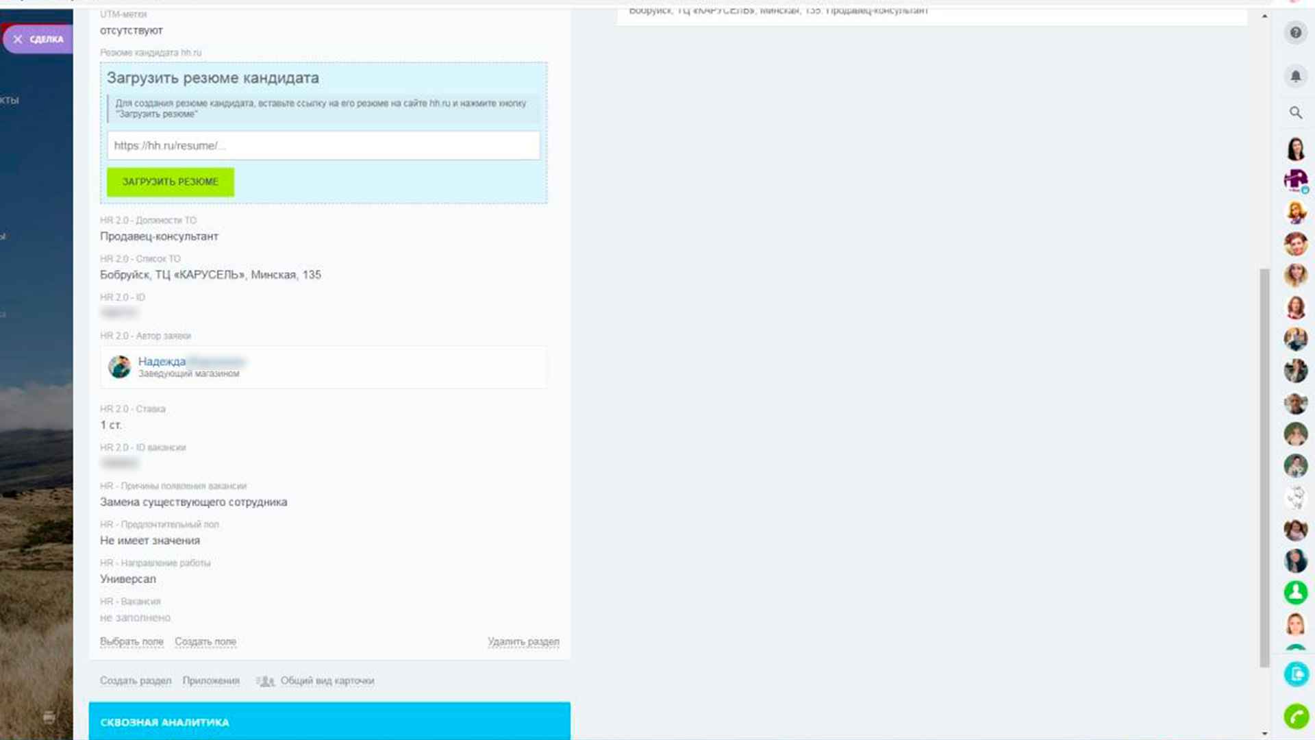 2) Появилась возможность “подтягивать” в CRM резюме к конкретным открытым позициям со своего сайта и сервиса HeadHunter. При этом теперь можно создавать базу,