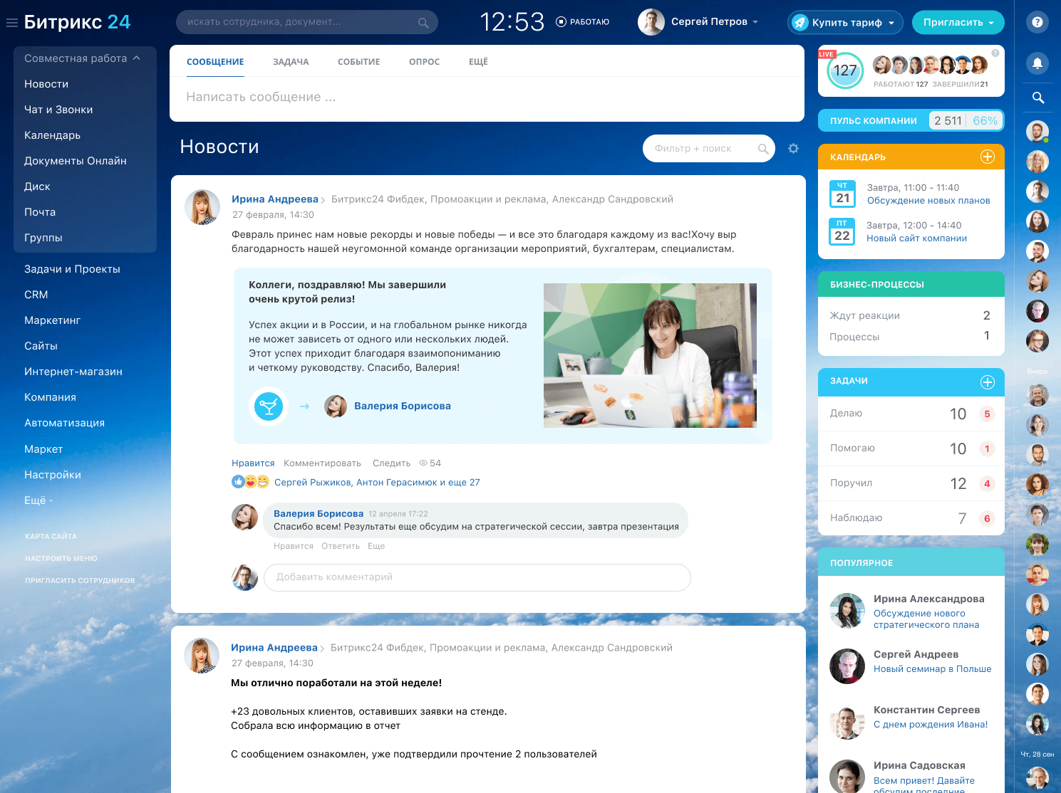 Битрикс24 систематизирует информацию по клиентам, задачам и проектам, являясь единым хранилищем данных. Благодаря «умному поиску», информация по клиентам и сделкам всегда под рукой.