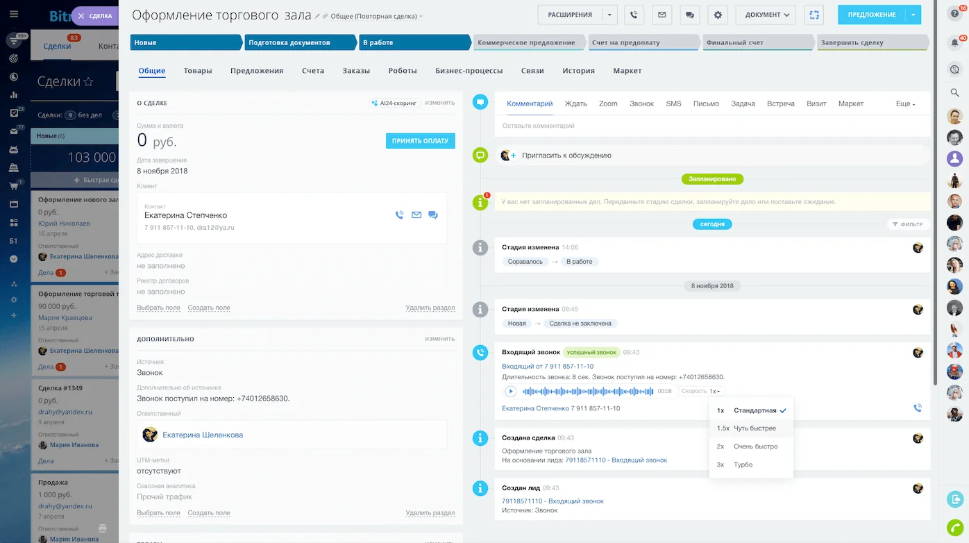 Все входящие и исходящие телефонные разговоры записываются и сохраняются в карточке клиента. Вы можете проверить, как менеджеры общаются с клиентами, соблюдают ли они регламенты.