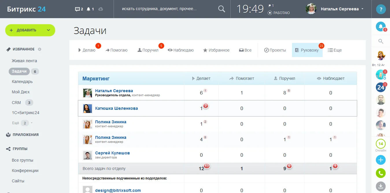 Просматривайте задания с разными ролями: «Делаю», «Помогаю», «Поручил», «Наблюдаю». Красные счетчики покажут, где «горят» сроки и требуется вмешательство. Обращайте внимание на просроченные задачи или задачи без крайнего срока. Используйте для контроля сводки и проекты. Чек-листы и подзадачи покажут, на какой стадии выполнения сейчас многоэтапные проекты.