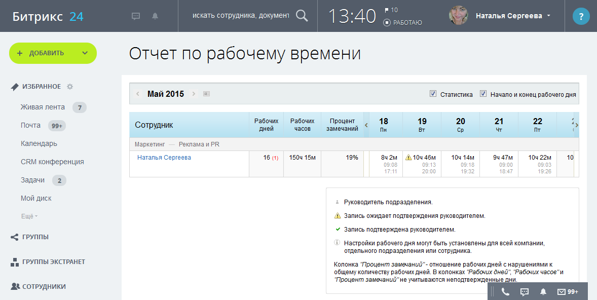 Мониторинг рабочего времени сотрудников выполняется с помощью задач, событий календаря, а еще инструмента личного хронометража «учет рабочего времени».
