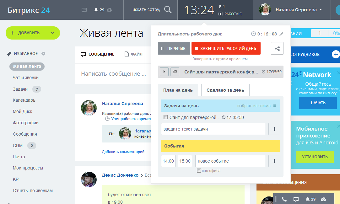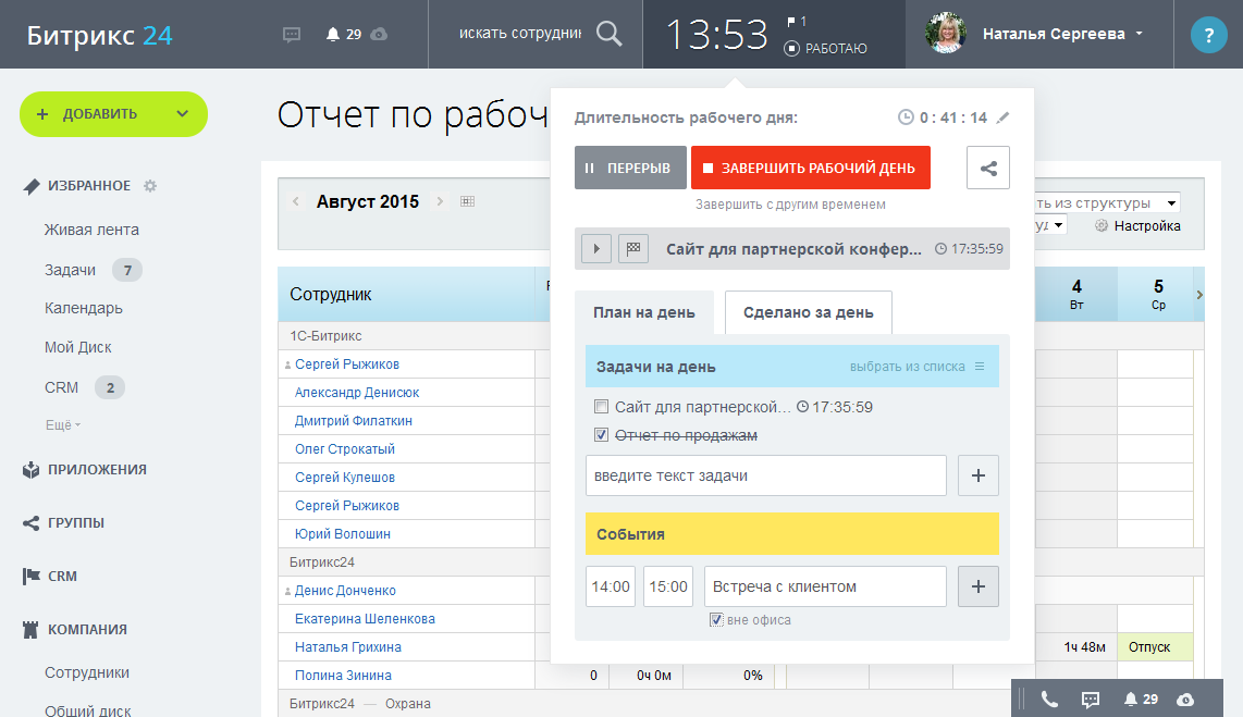 При этом сотрудник планирует рабочий день, выбирая задачи из списка или вписывая собственные. После этого автоматизированная система учета рабочего времени «Битрикс24» распределяет рабочее время между запланированными задачами. Выделяется время также на планерки, совещания и встречи, запланированные руководством или коллегами через задачи и календарь.